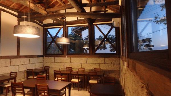 ”カフェ巣廊”店内。古い柱と深岩石がどっしりと落ち着いた雰囲気。お勧めメニューは香りと器にこだわった