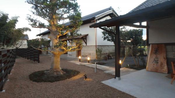 奥に見えるのが長屋門”ギャラリー巣廊”。手前がかつては納屋だった”カフェ巣廊”。中央の大きな木シンボルツリー