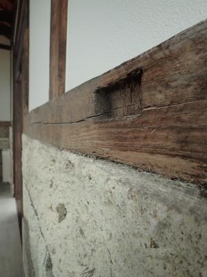 今から90年程前にこの場所に移築された長屋門と昭和初期に落雷による焼け跡を残した納屋。