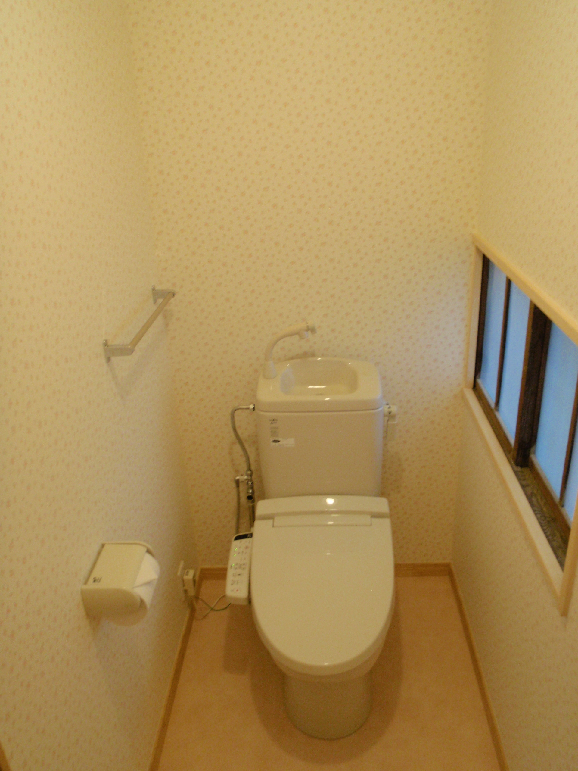借家住まいのお客様ですが、トイレはキレイにリフォームしたいと大家さんを説得。仕事柄、小さい子達が集まるのでボットンでは心配でした。安心してトイレを使ってほしい、キレイで暖かいトイレを使ってほしい・・そんなお客様のやさしさがあふれる空間になりました。◆施工内容◆・洋風簡易水栓便器(手洗付、シャワートイレ)に変更。・床・・壁下地内装、クッションフロア。・壁、天井・・クロス仕上げ◆施工日数/5日◆工事費/40.5万円 ◇お客様のご要望◇・借家だけどトイレは綺麗に使いたい。・仕事柄、小さい子供が遊びに来るが、汲取り便所では不安。・トイレが狭いので、広くしたい。・トイレが寒いので、暖かくしたい。