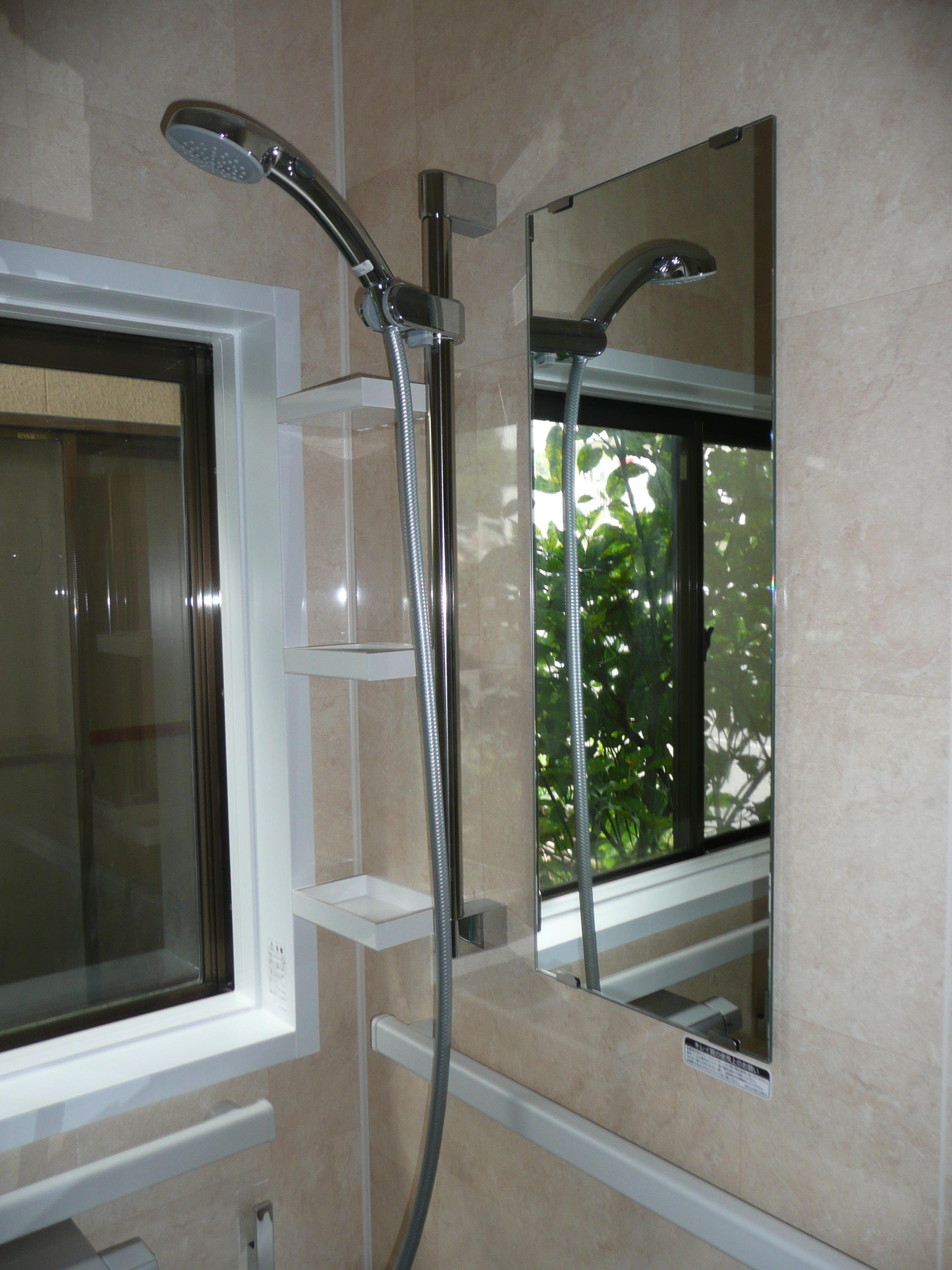 シャワーや鏡、小物入れは窓をよけ右面に配置しました。
