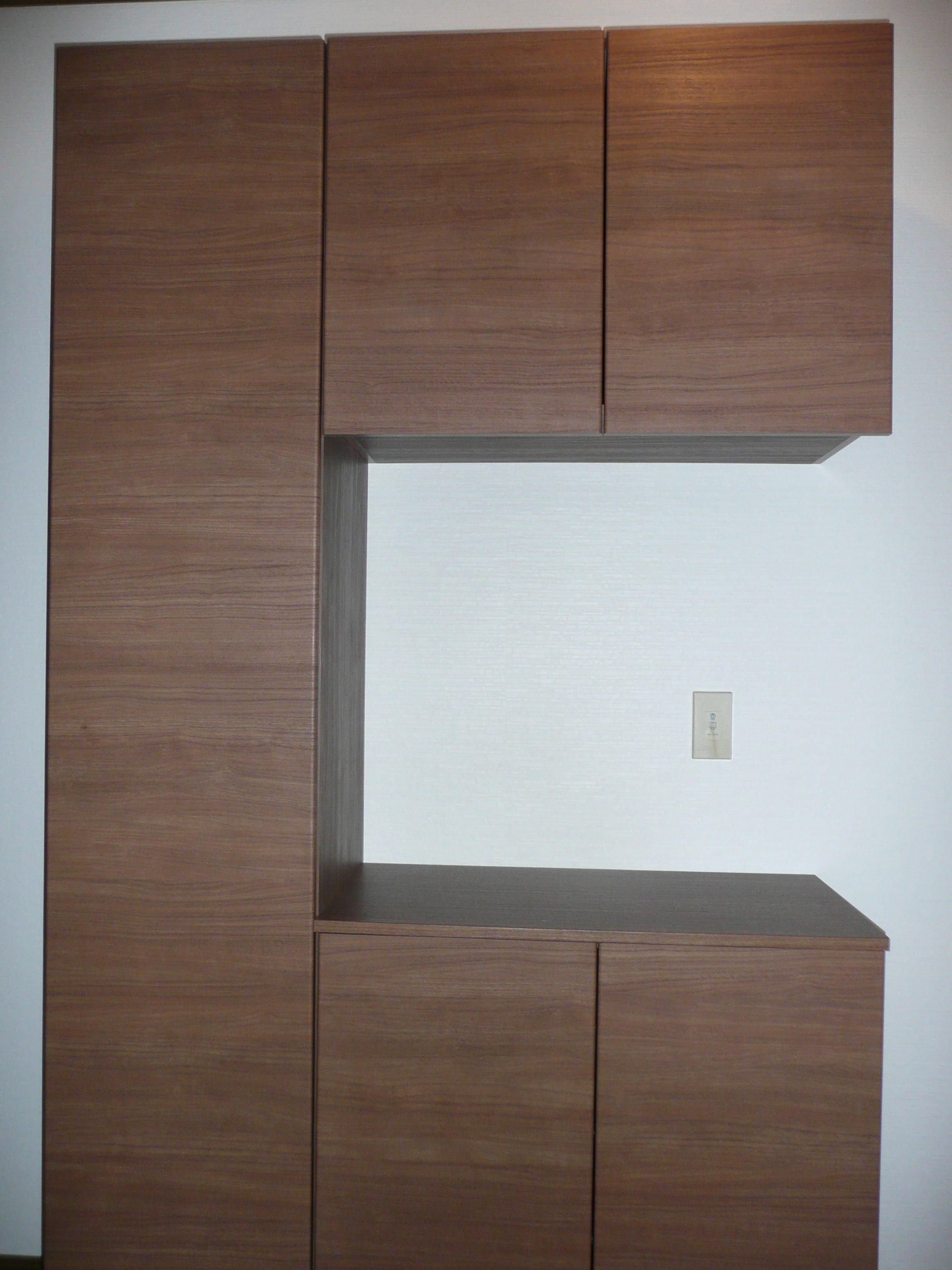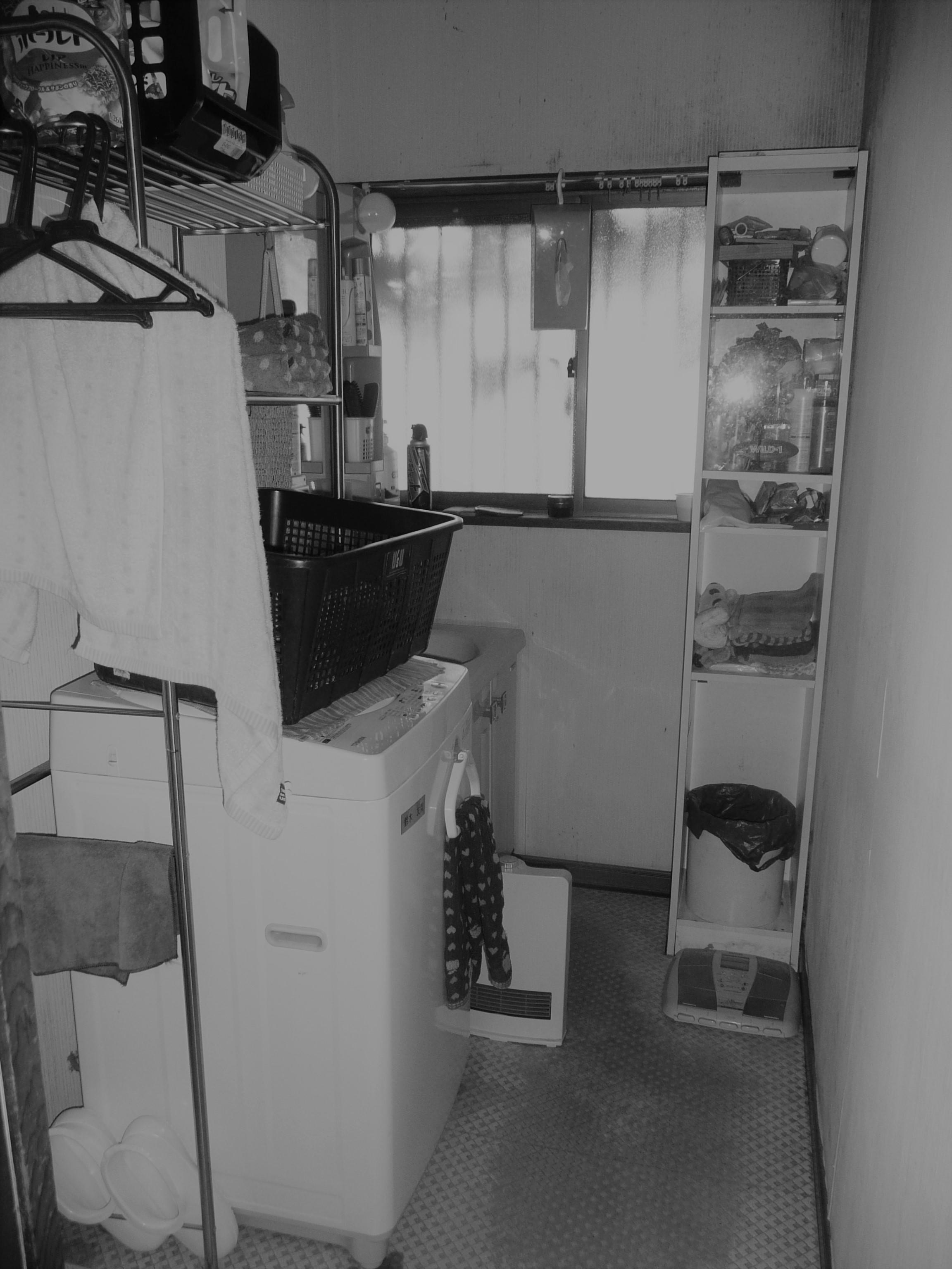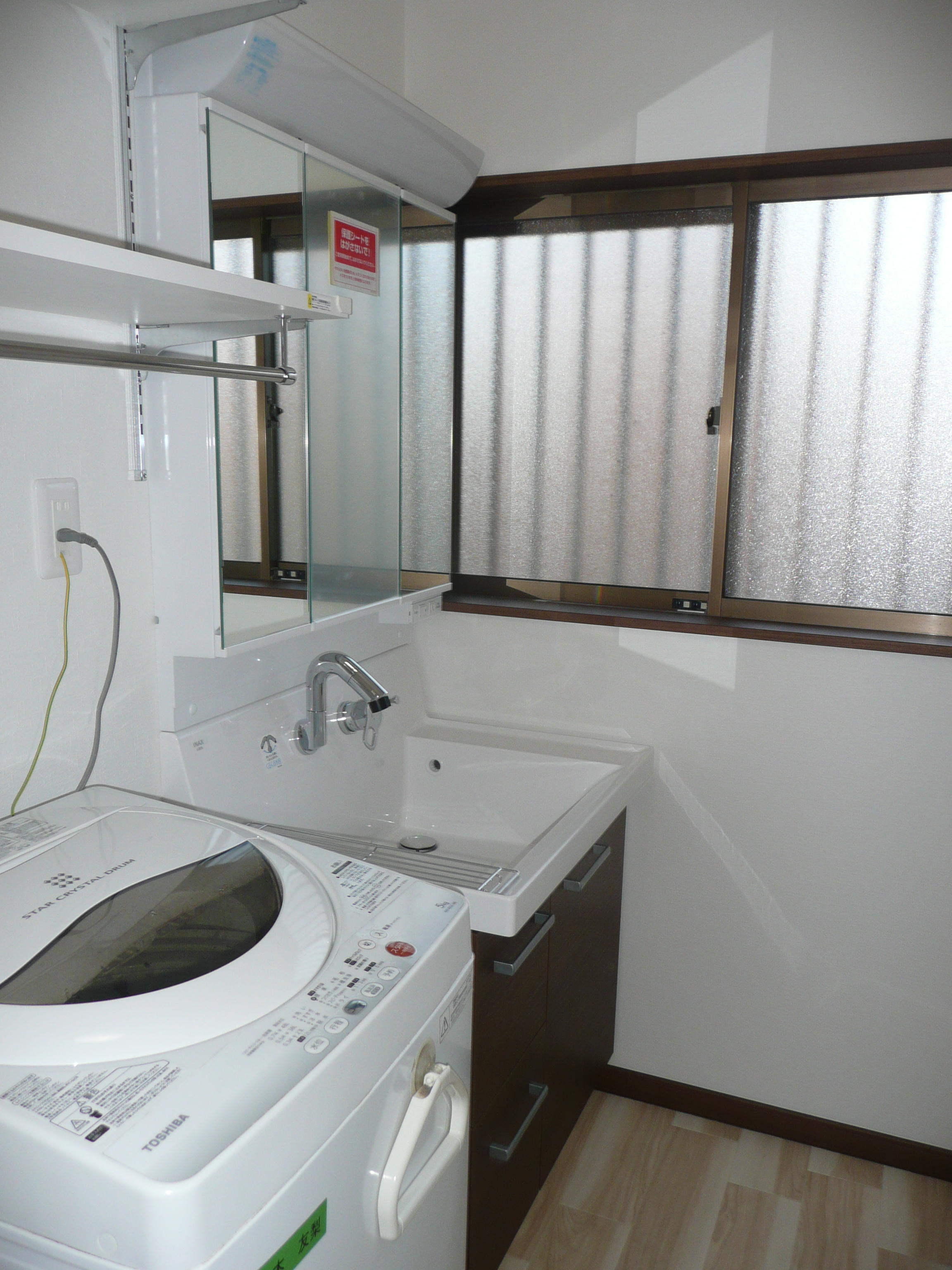 【施工前】洗面化粧台が幅60㎝。収納が必要なため、洗濯機をまたぐような脚があるタイプの上置き棚を使用していました。