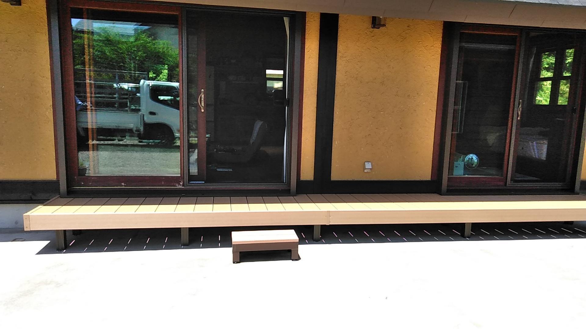 とても広いウッドデッキでしたが、今後のメンテナンスの事で悩まれていました。メンテナンス作業も簡単な『LIXIL 樹ら楽ステージ』に変わり、面積を少なくして、もっと有効的にスペースを使われる事にしました。防犯性の高いシャッターで安心な暮らしが出来ますね!