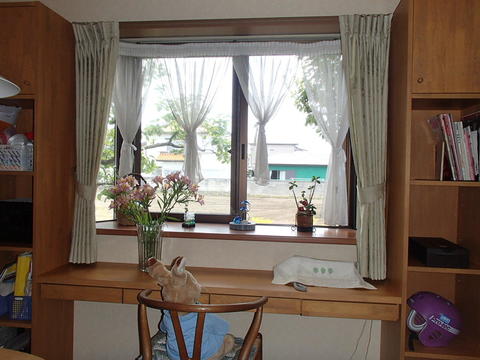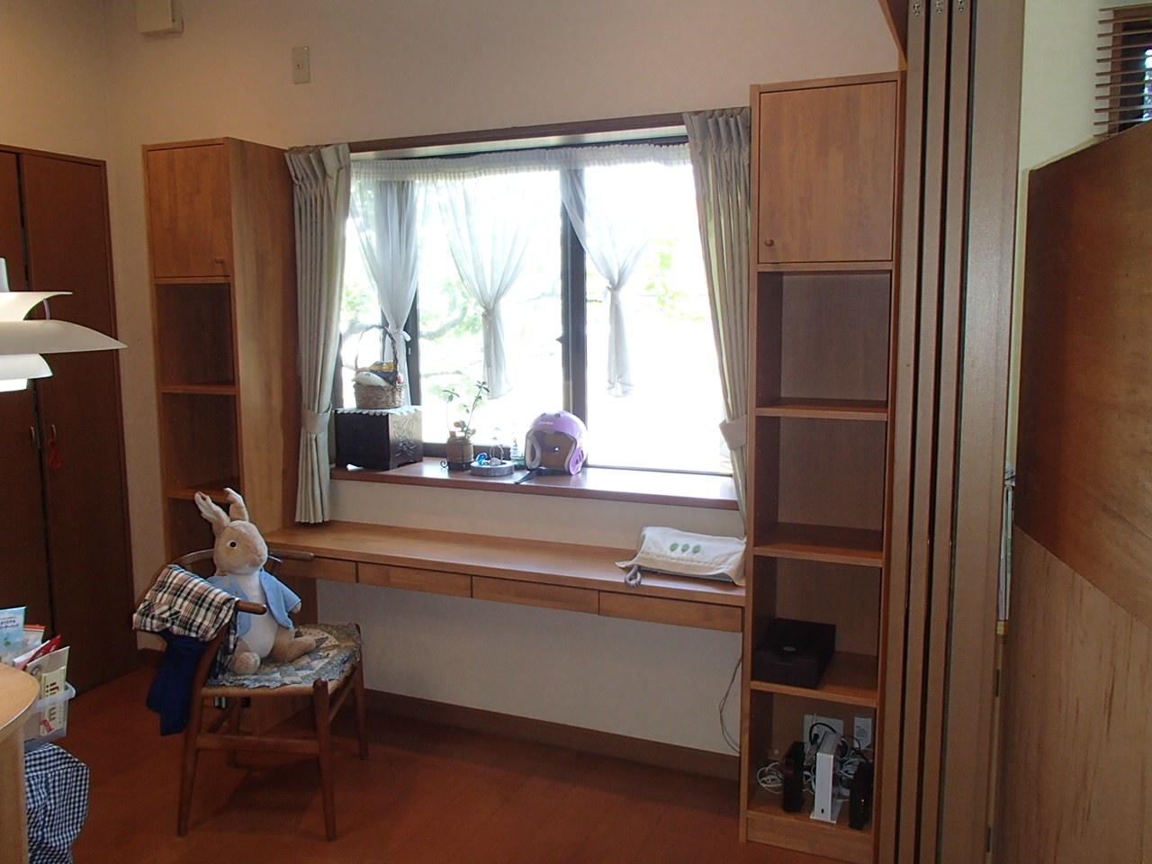 窓からの景色を眺めながらパソコンや読書など趣味を楽しめるカウンターデスクと、収納棚を組み合わせました。