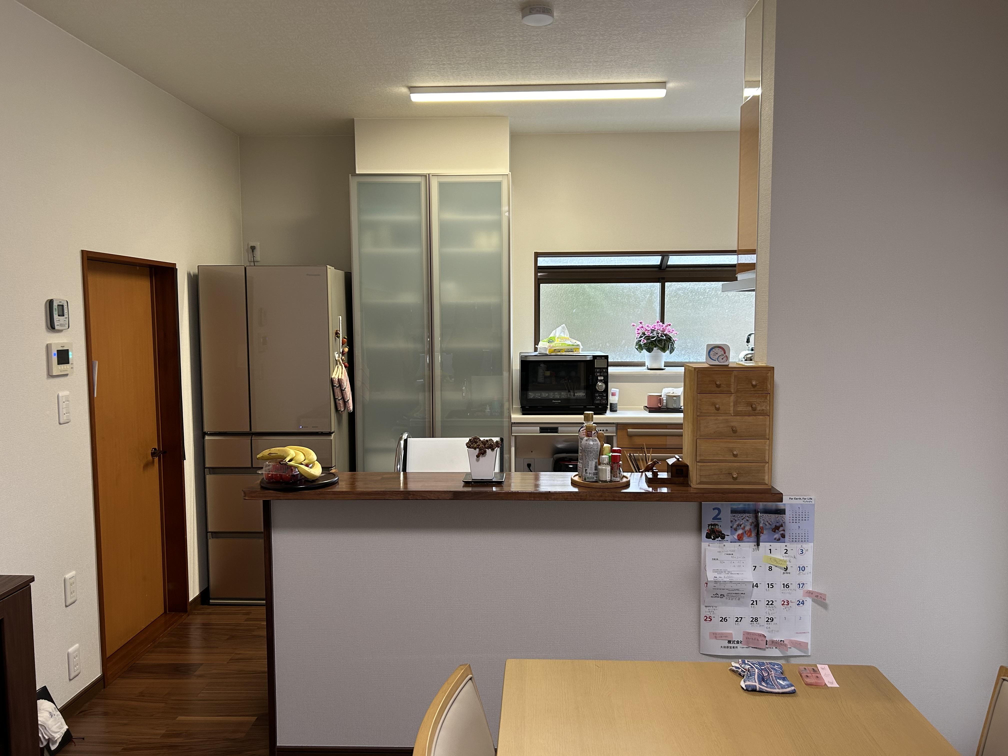 以前は壁付のL型キッチンと吊戸棚付きのカウンター収納で仕切られていたため、ダイニングにいるご主人とはコミュニケーションがとりずらい状態でした。