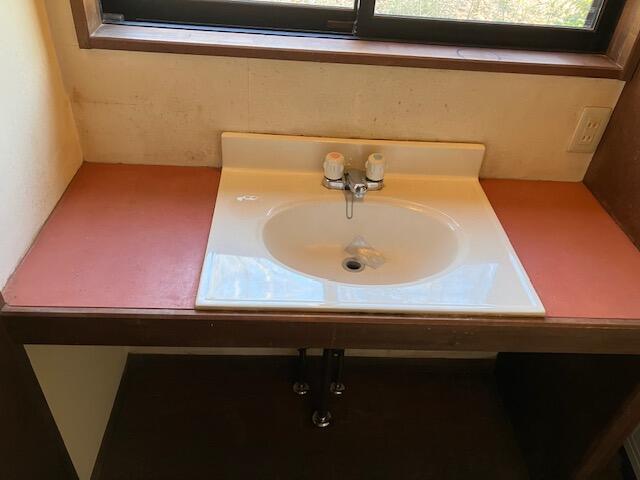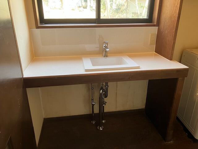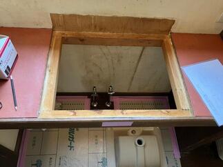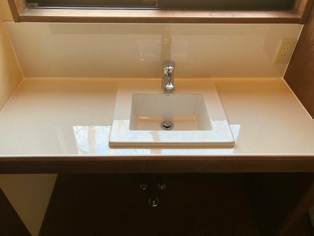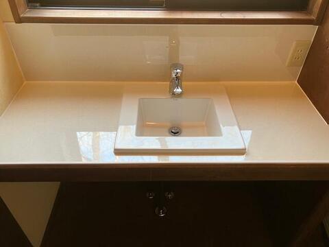 そこで!木製カウンター上部と壁面には、お手入れ簡単なキッチンパネルを貼って、開口穴を隠しながらキレイな洗面空間をご提案!