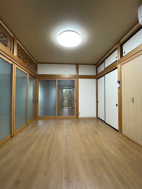 今まで畳にお布団でお休みになられていましたが、布団の上げ下げも大変なのでフローリングに変更、配管工事は複雑になりますが、縁側を突っ切って配管を外へ出し、壁掛けエアコンを新設、そのエアコンの熱を効率よくお部屋に循環させられるよう、障子・襖を取り払い、LIXILの「インプラス間仕切仕様」に交換しました。「インプラス」と言えば、既存の窓の内側に付ける内窓として取付けますが、今回は室内建具として使用しました。今までの障子や襖とは違い、戸を閉めると「ミチッ」とした気密感が感じられ、かつフロストガラスで全体で程よい明るさを部屋に取り込みながら、寝室空間としてきちんとプライバシーも確保できる空間になりました。