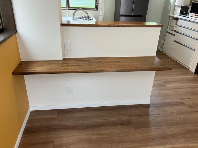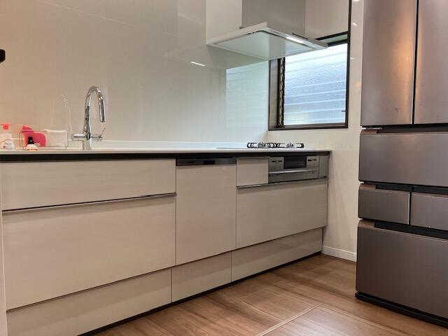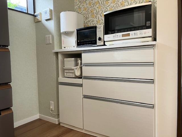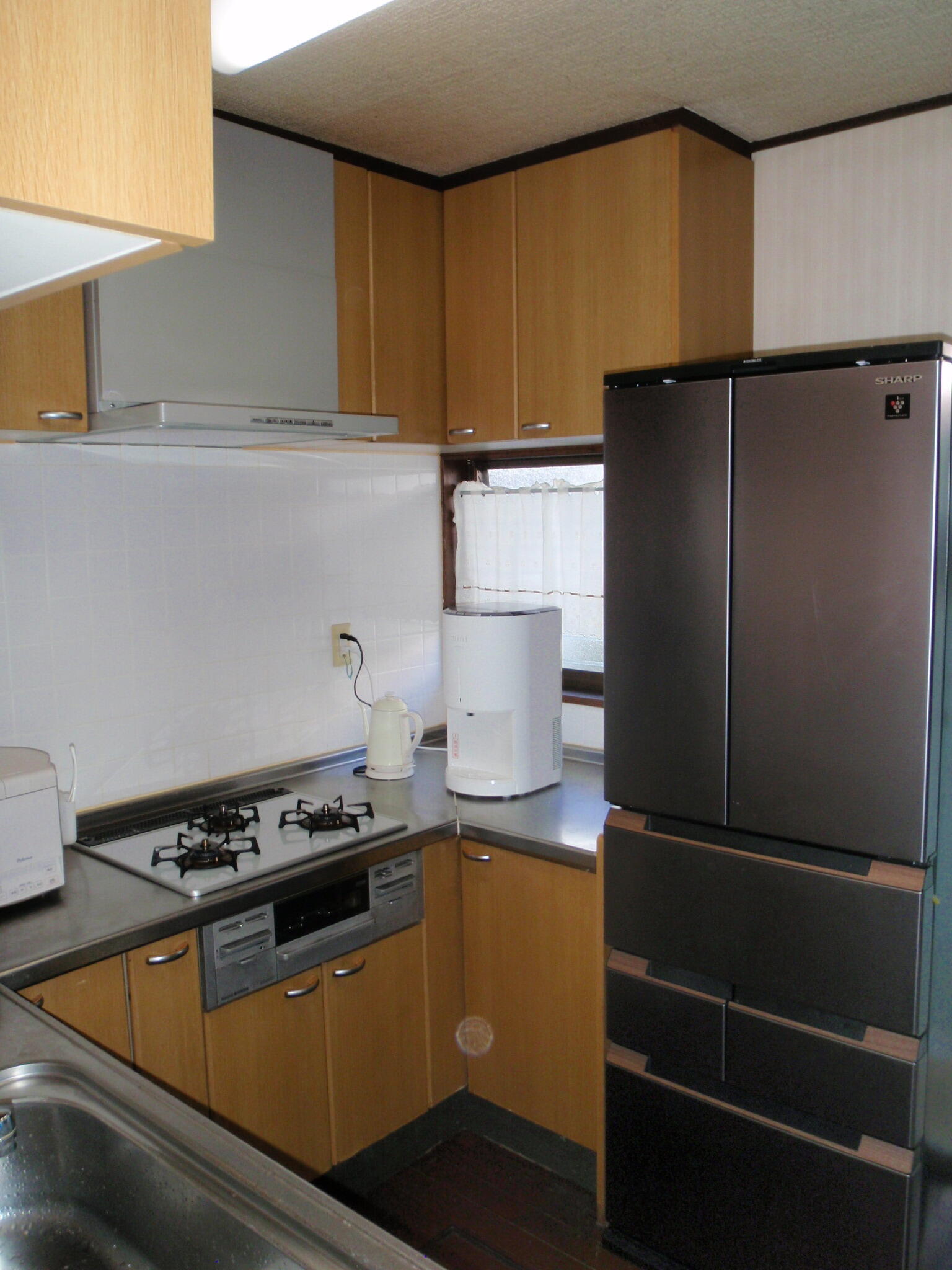 以前のキッチンはコノ字型のキッチンで、お客様もコンパクトなスペースが気に入っていましたが、使いにくい吊戸棚が圧迫感と採光の妨げになったり、余り使わず寒い勝手口がご不満な感じでした。リビング・ダイニングとキッチンを隔てる下がり壁を撤去し、天井がフラットになり空間が広く感じる様になりました。勝手口のドアと土間部分を塞ぎ、ドアの欄間部は明り取り窓を付けて残す事にしました。全ての既存窓に内窓を設置し、断熱の良い空間になりました。床フローリングの上張りと壁・天井のクロスを張替えて、新築当時に様変わりしました。既存の食器棚もご要望通りリメイクして再利用したり、以前使われていた集成カウンター材もお食事スペースのカンンターに利用し、思い出も要所に残したリフォームになりました。