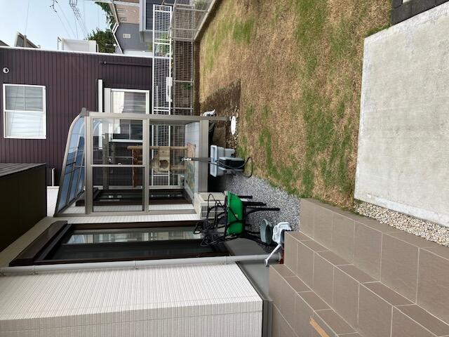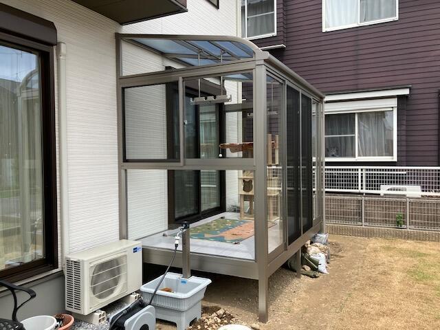 お客様よりテラス設置の要望があり用途を伺うと『猫ちゃんがくつろぎ、外を眺められる場所を作りたい。』との事でした。LIXILのサニージュ床納まり仕様で間口2間×奥行6尺タイプをご提案しました。既存の窓にシャッターが付いていた為、屋根の形状はRタイプを選定し正面は引戸、側面は高窓仕様を選定しました。猫ちゃんがくつろぎ、ご主人様は庭の手入れの合間に休憩したりと、みんなのお気に入りの場所になる事でしょう!