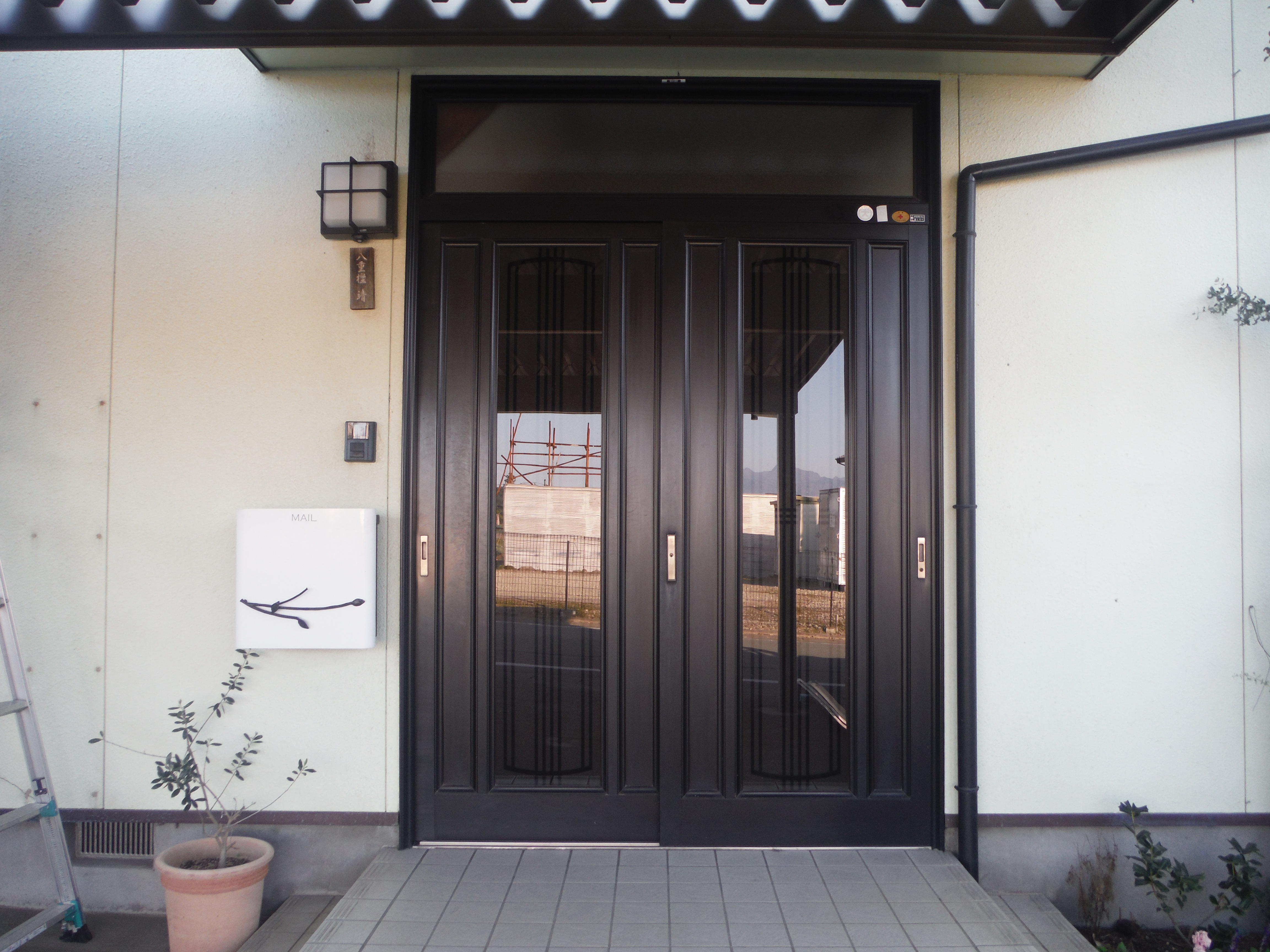 からっ風が吹くと砂が家の中に入るのと寒いというお悩みを解決するため、密閉性が良く断熱性能のある玄関ドアリシェントへの取替をご提案しました。