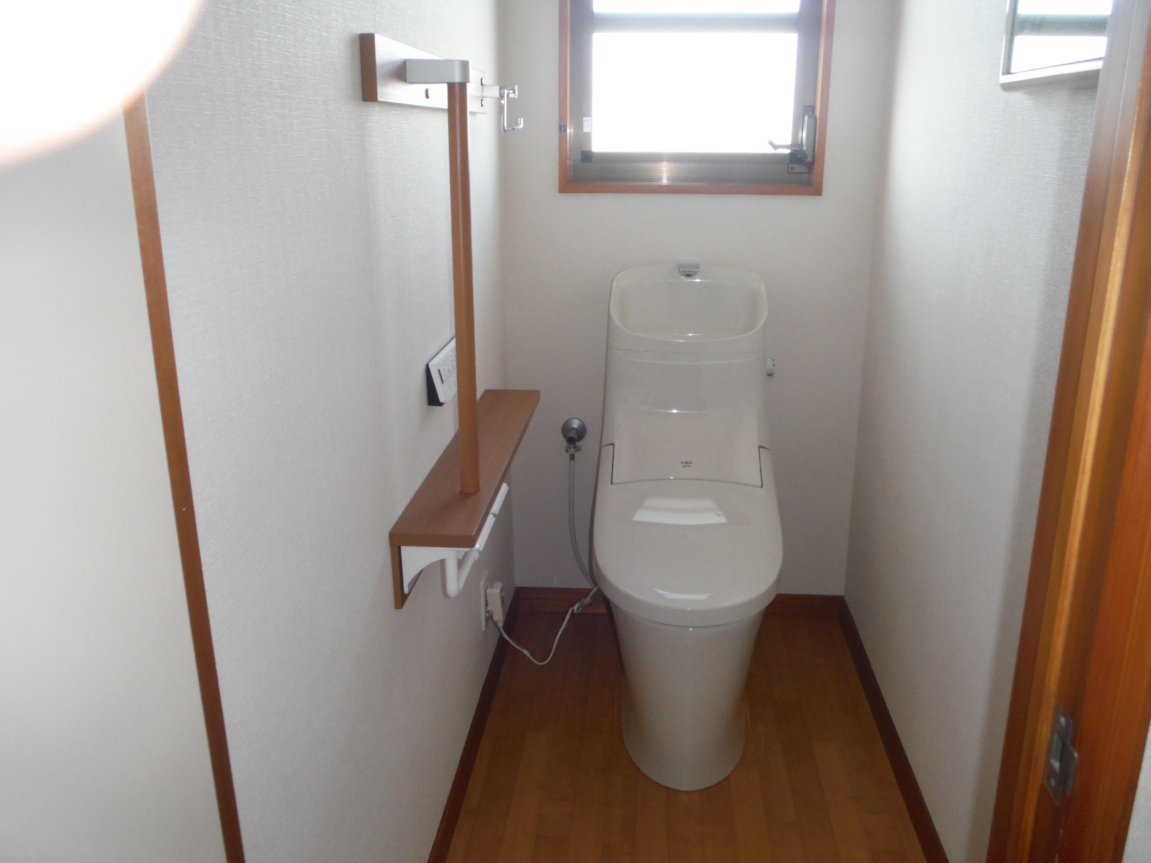 トイレ取替と内装工事で、使いやすく・明るい空間になりました。また、下地工事の必要がない後付棚手すりを取り付けることで、立ち座りが楽になります。