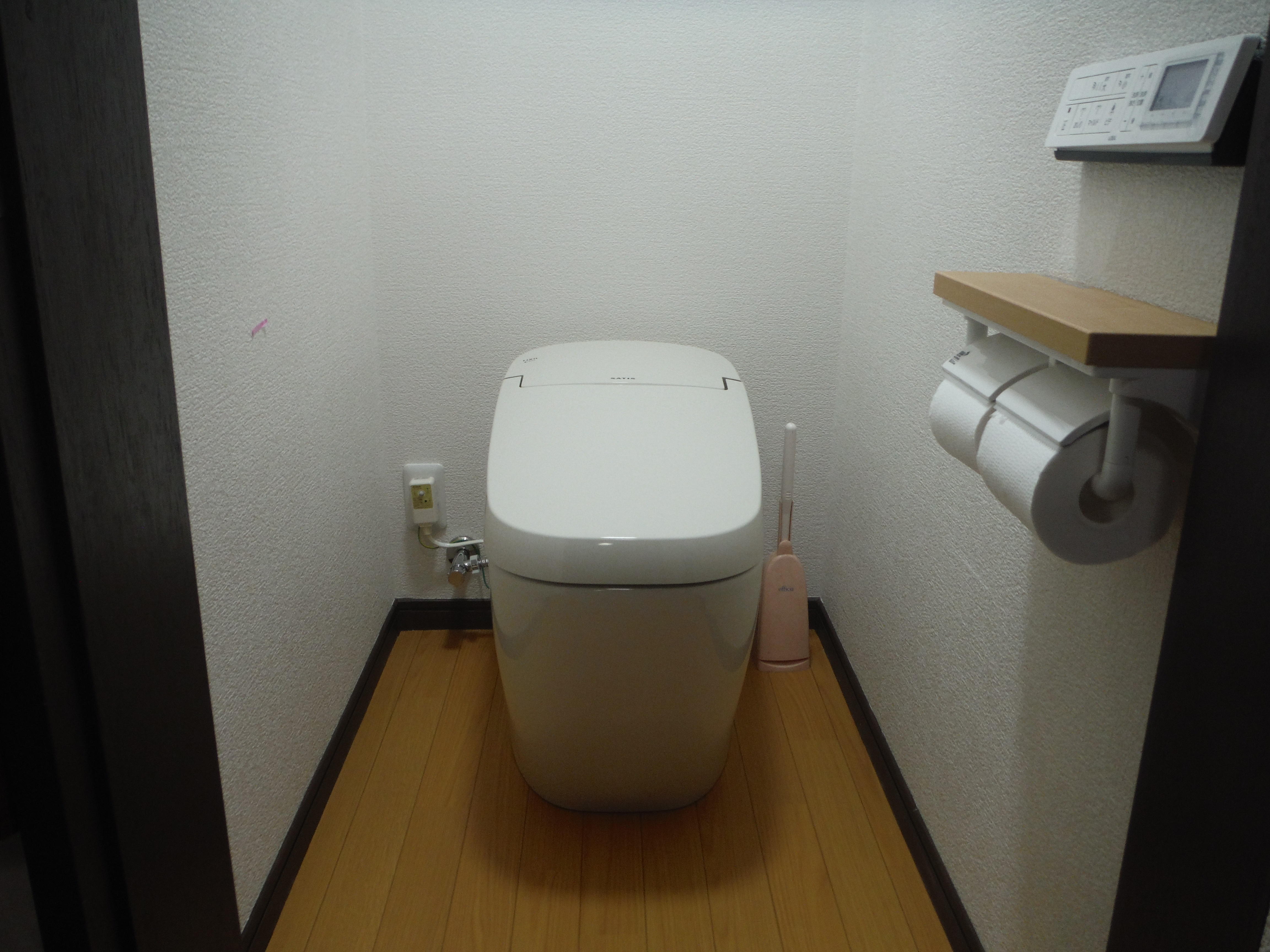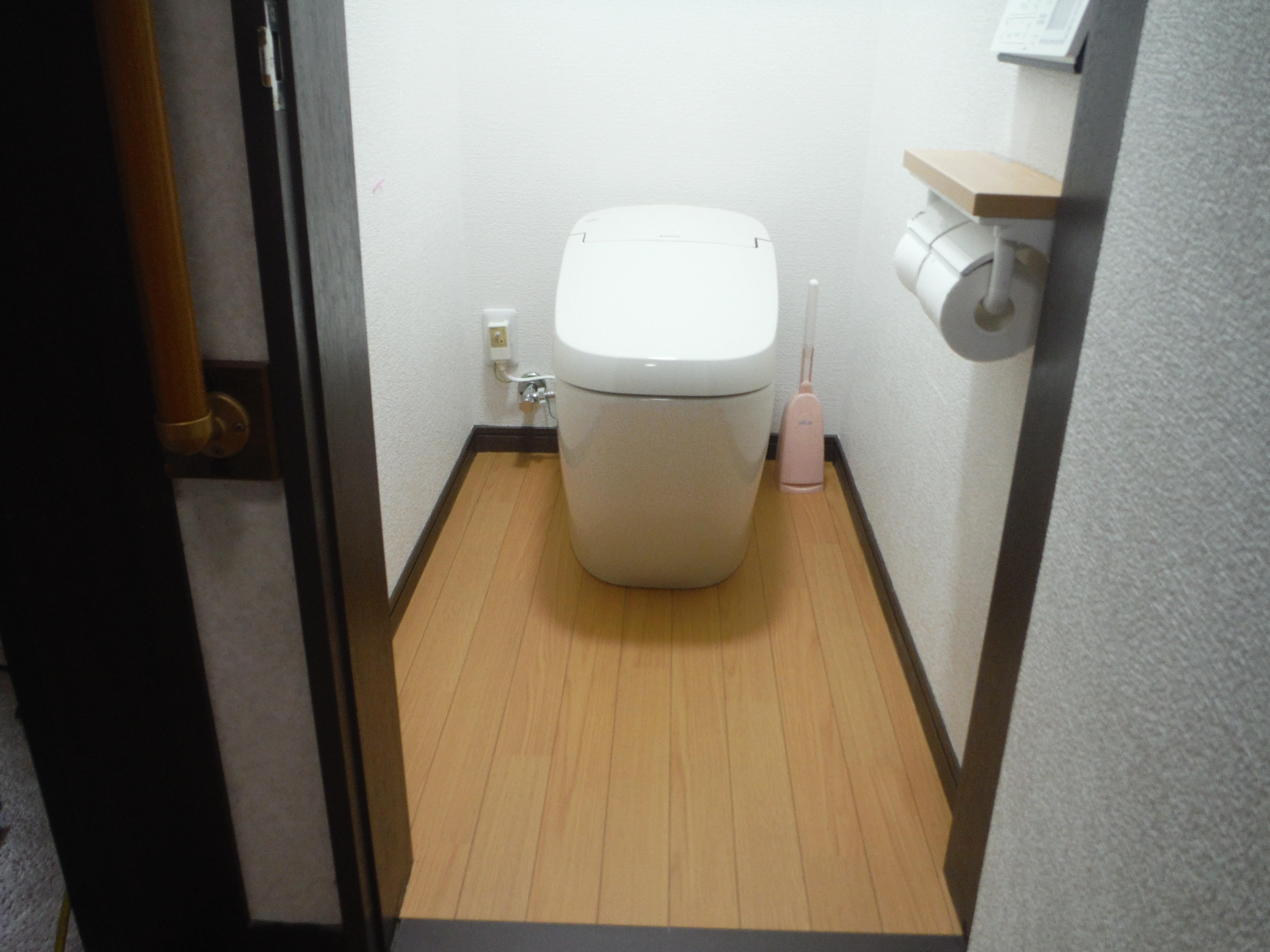 タイルで冷たく暗いトイレが、暖かく明るく使いやすいトイレに生まれ変わりました。後から手すり等が付けられるように、壁に木下地を入れてあります。