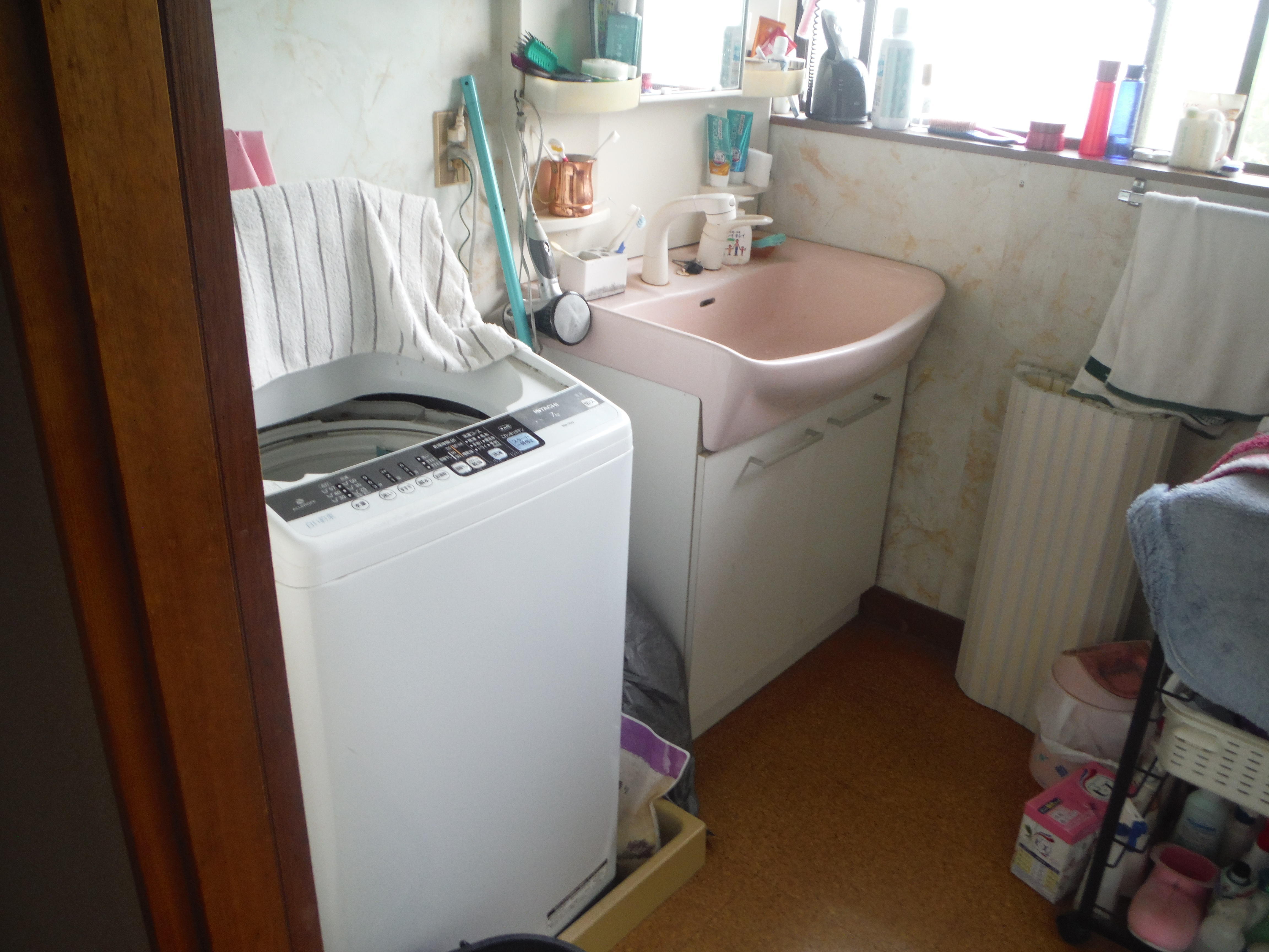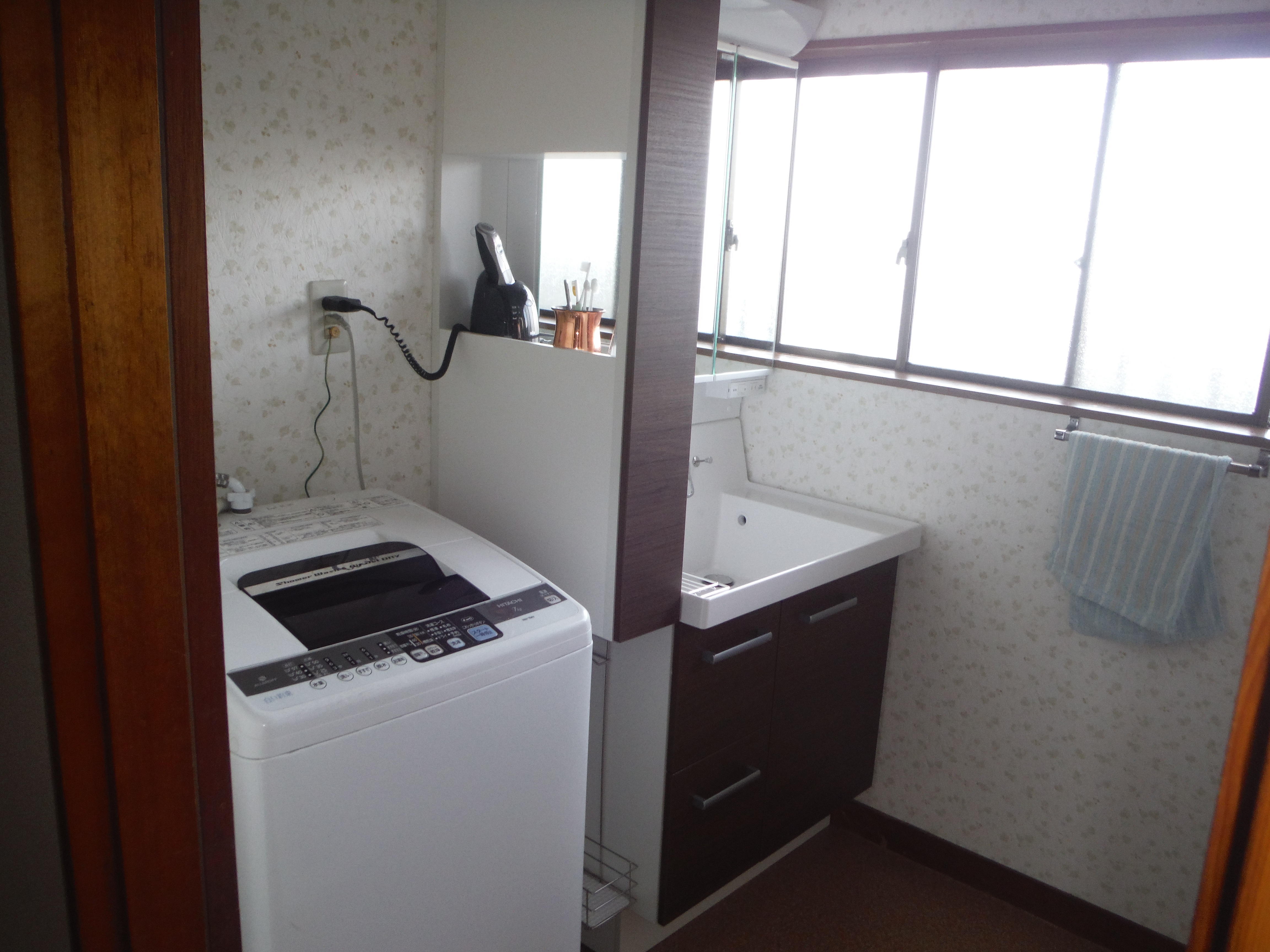 収納量たっぷりの洗面台に入替、洗面道具や洗濯剤等スッキリ収納でき、明るく使いやすくなりました。
