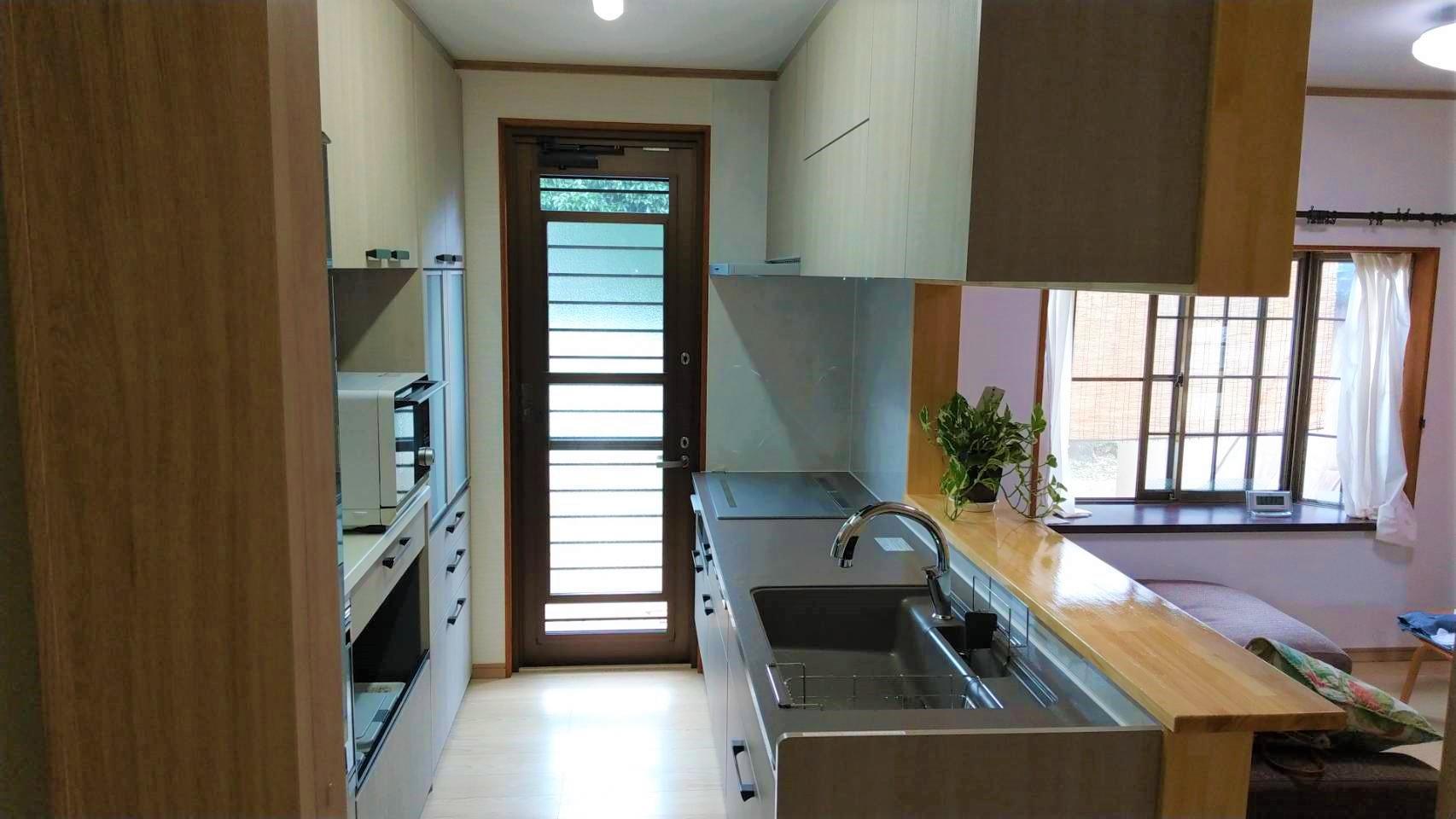奥様のご要望は、使い勝手と収納力。高くて使いにくかった吊戸棚はダウンウォールをつけて楽々収納。 らくパッと収納・大容量の背面収納を気に入っていただき、大変満足していただきました。