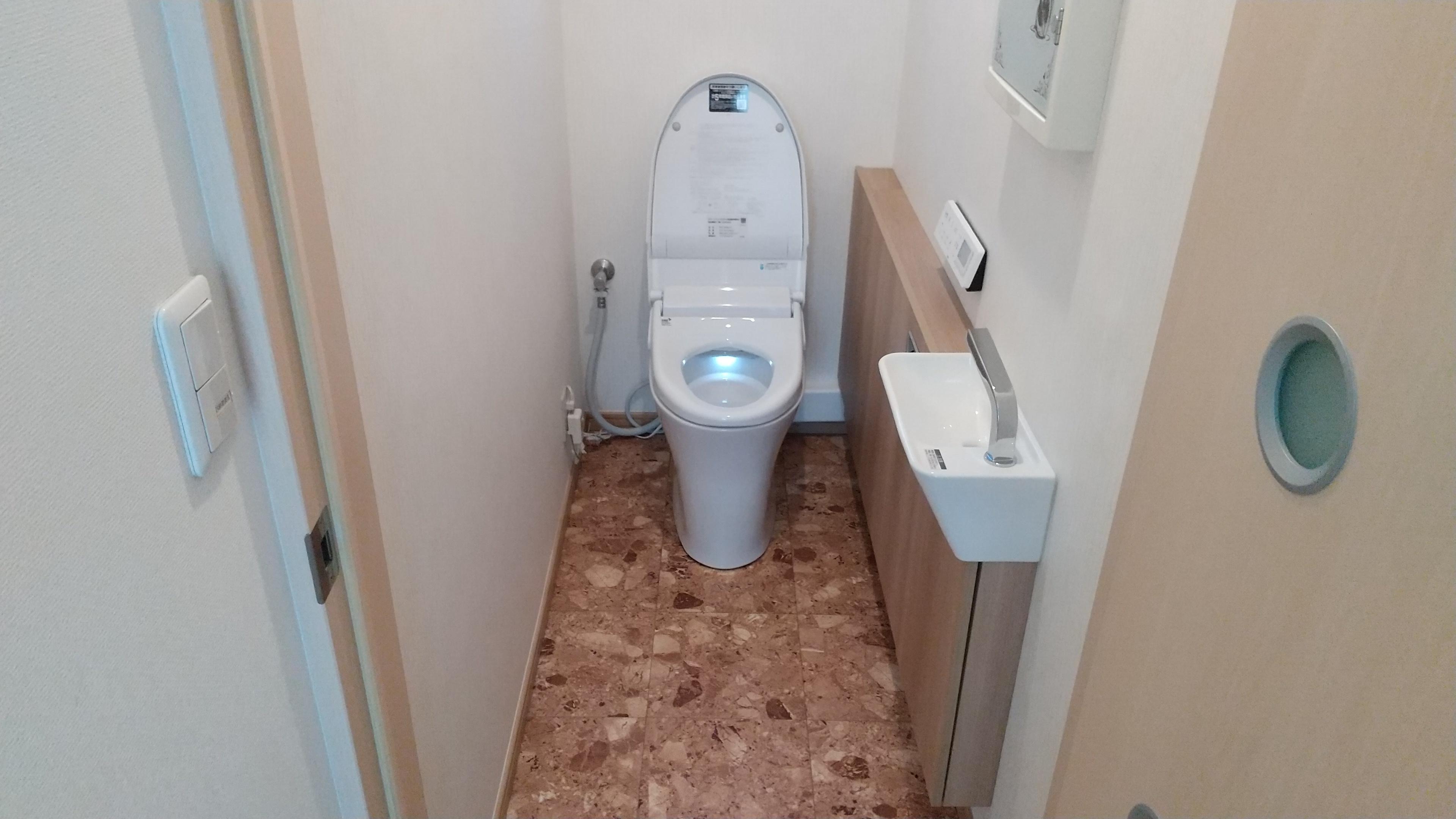 トイレ空間と手洗いを考慮しましてサティスSリトイレ手洗付を提案させていただきました。 給排水配管を隠すだけではなく、空間を彩る大型パネルによりトイレ周りがすっきりしました。