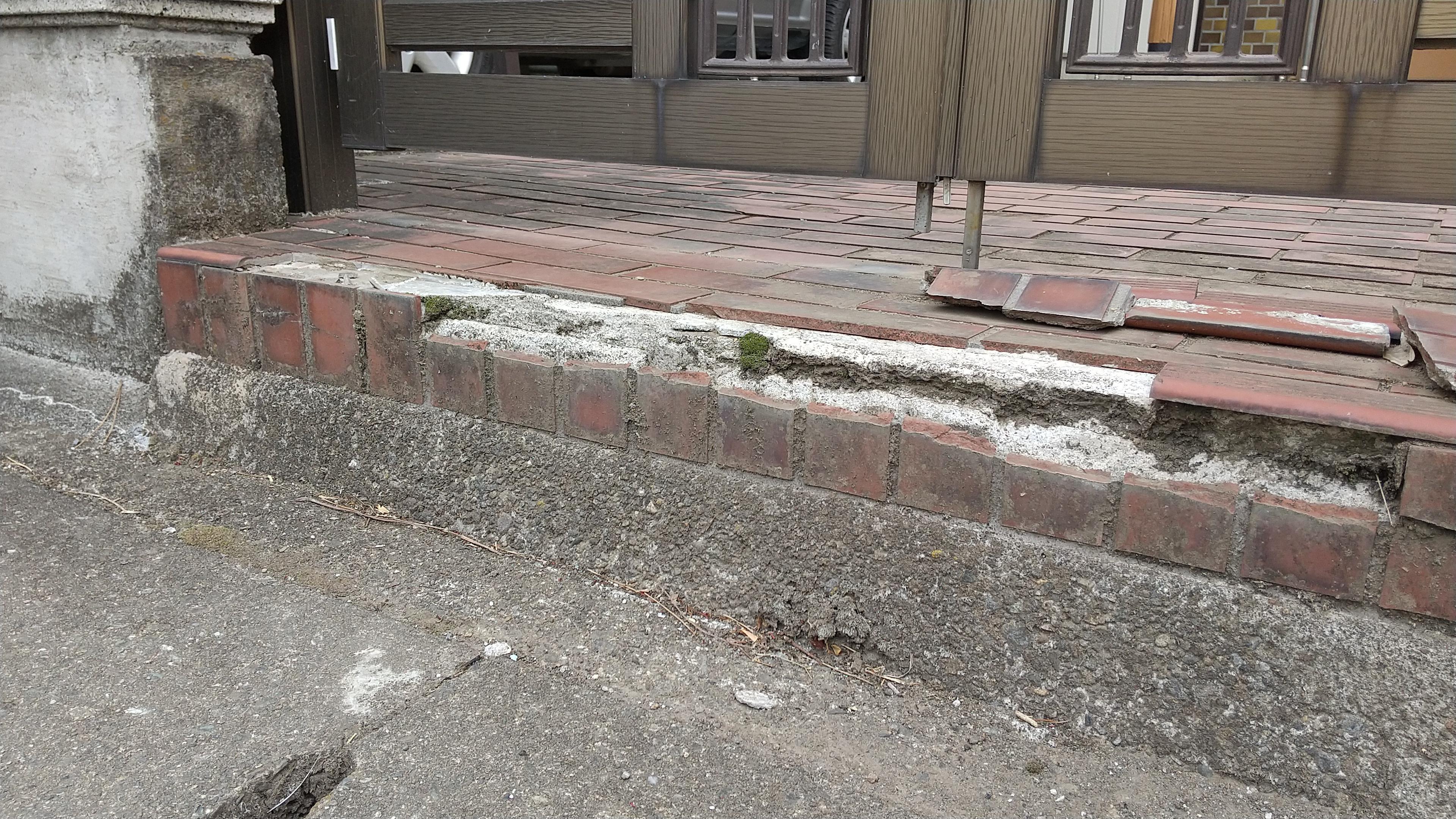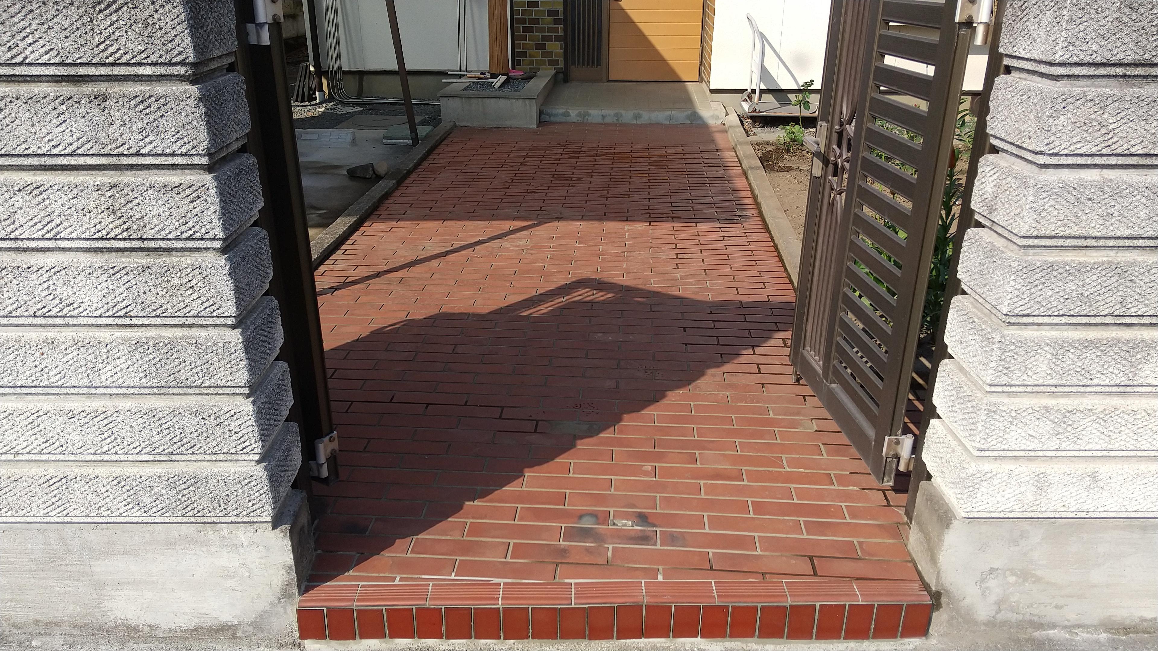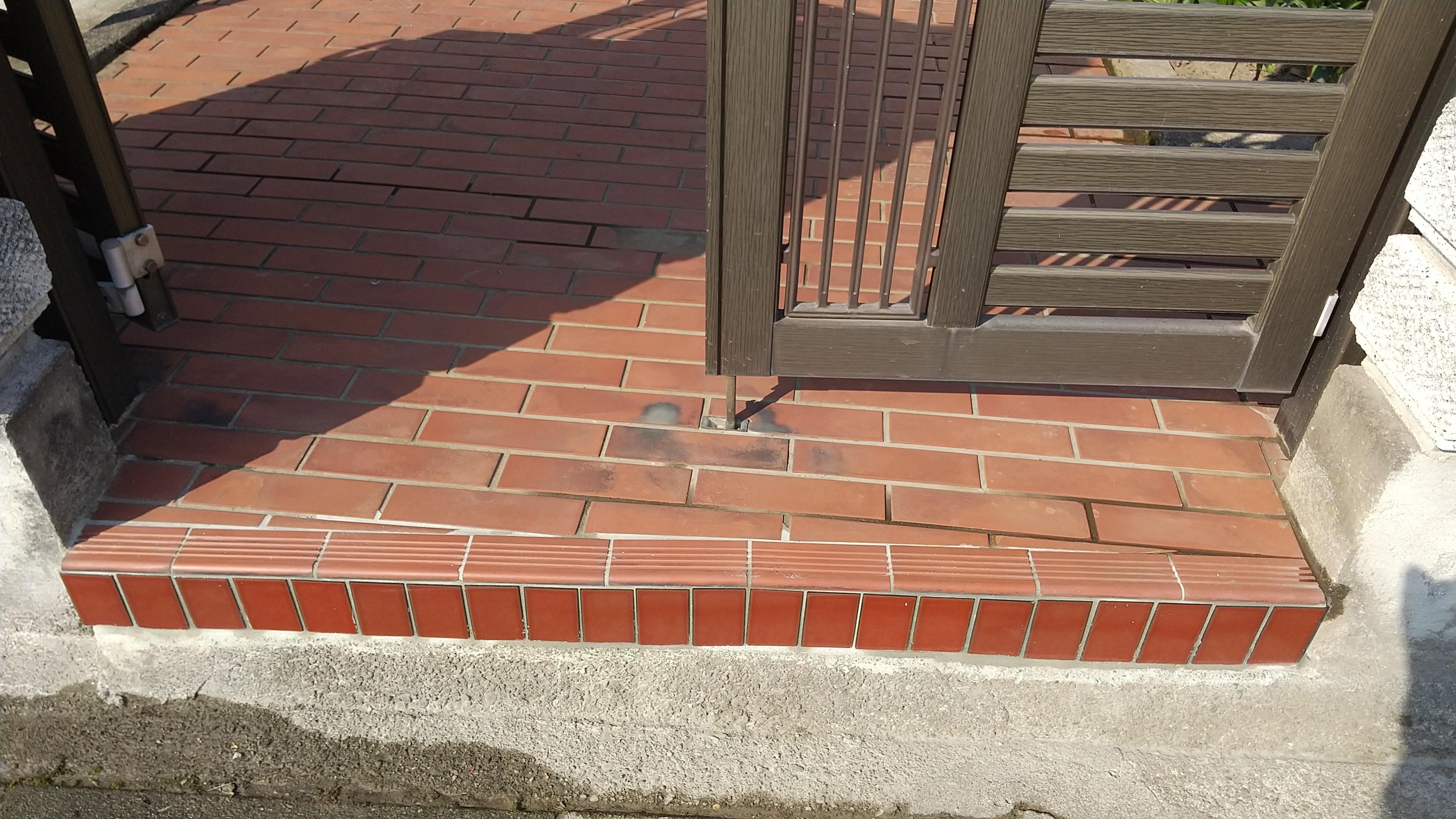 門扉の入口のタイルが剝がれてしまい危険なため、補修工事をさせていただきました。不要なタイル・コンクリートを剥がした後、既存のタイルを貼っていきます。縦方向のタイルは全く同じのもではありませんが、同系色を探し貼りましたので、違和感なく仕上がりました。