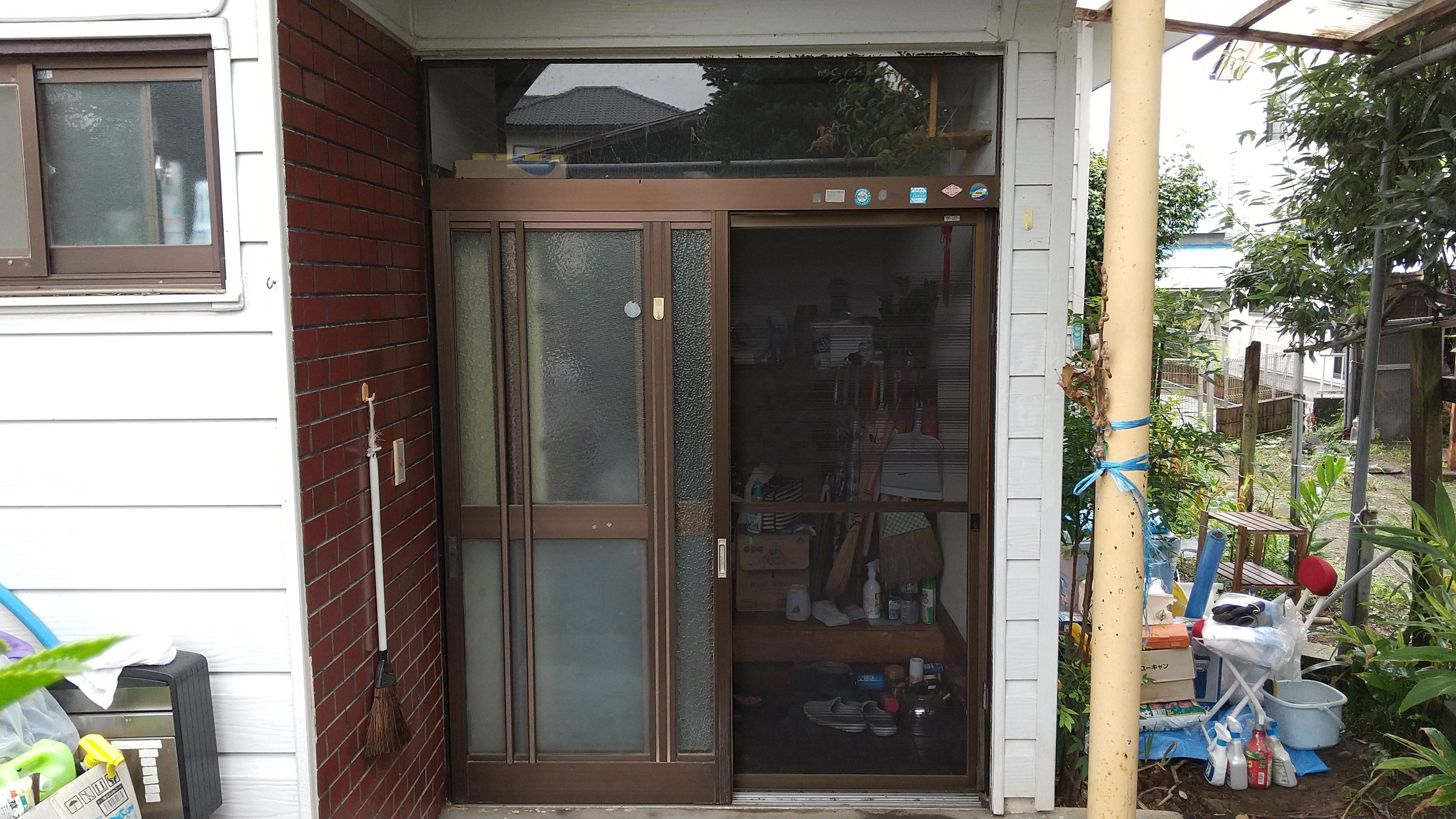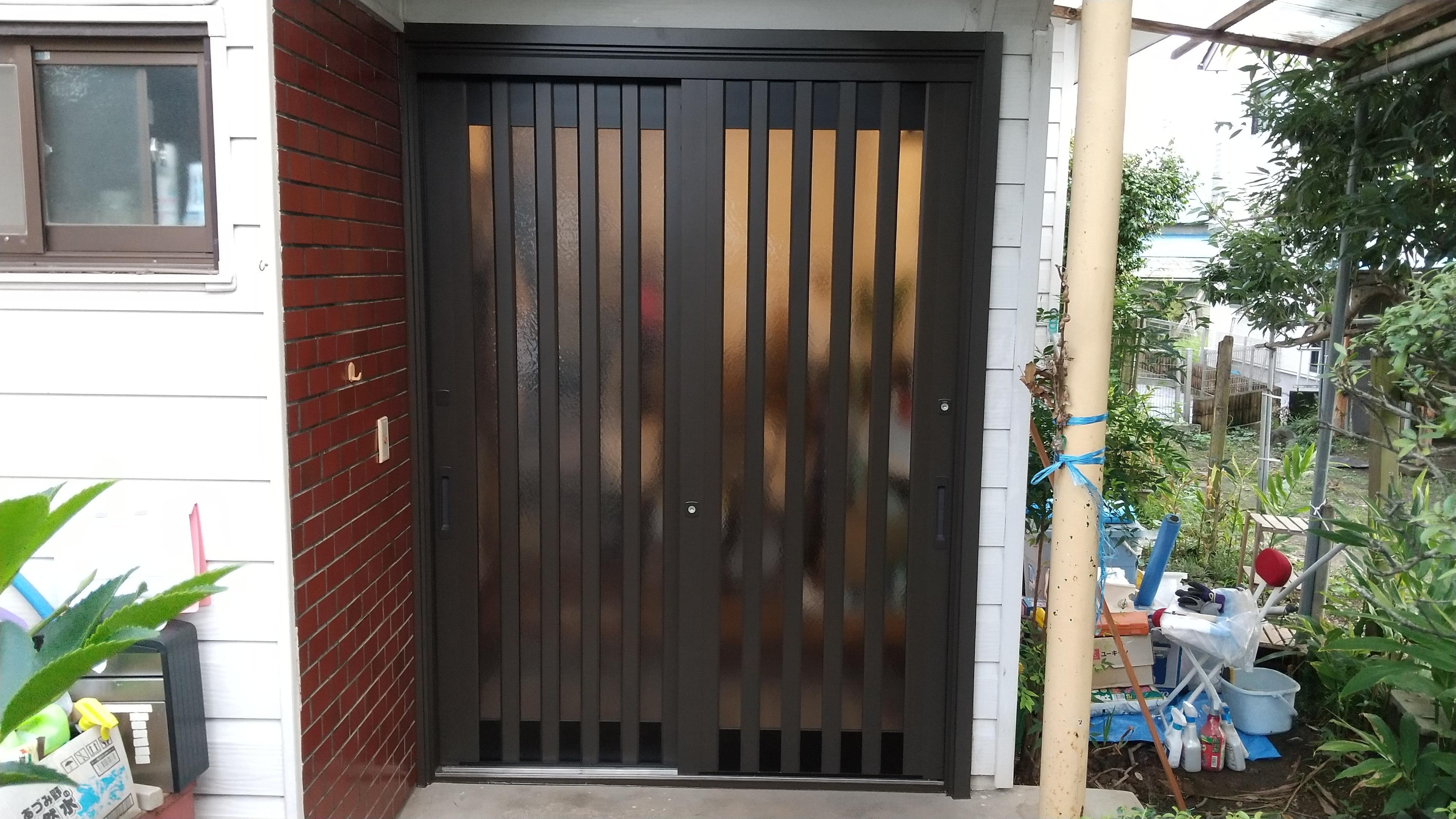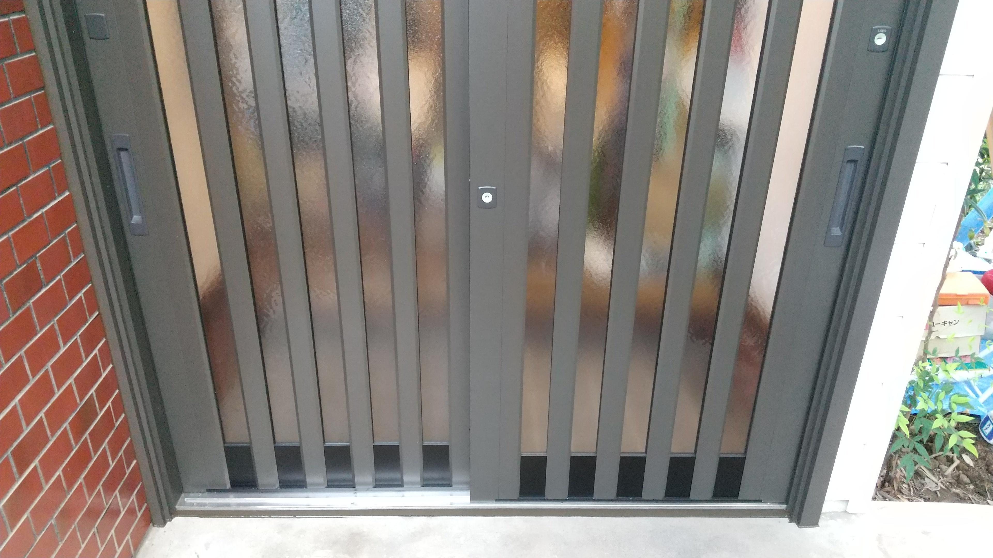 古くなり施錠や開閉が大変な引戸をリシェントの引戸にする事により、スムーズに開閉できるようになりました。他に目隠し可動ルーバーも取付をしオータムブラウン色で統一したので落ち着きのある仕上がりになりました。