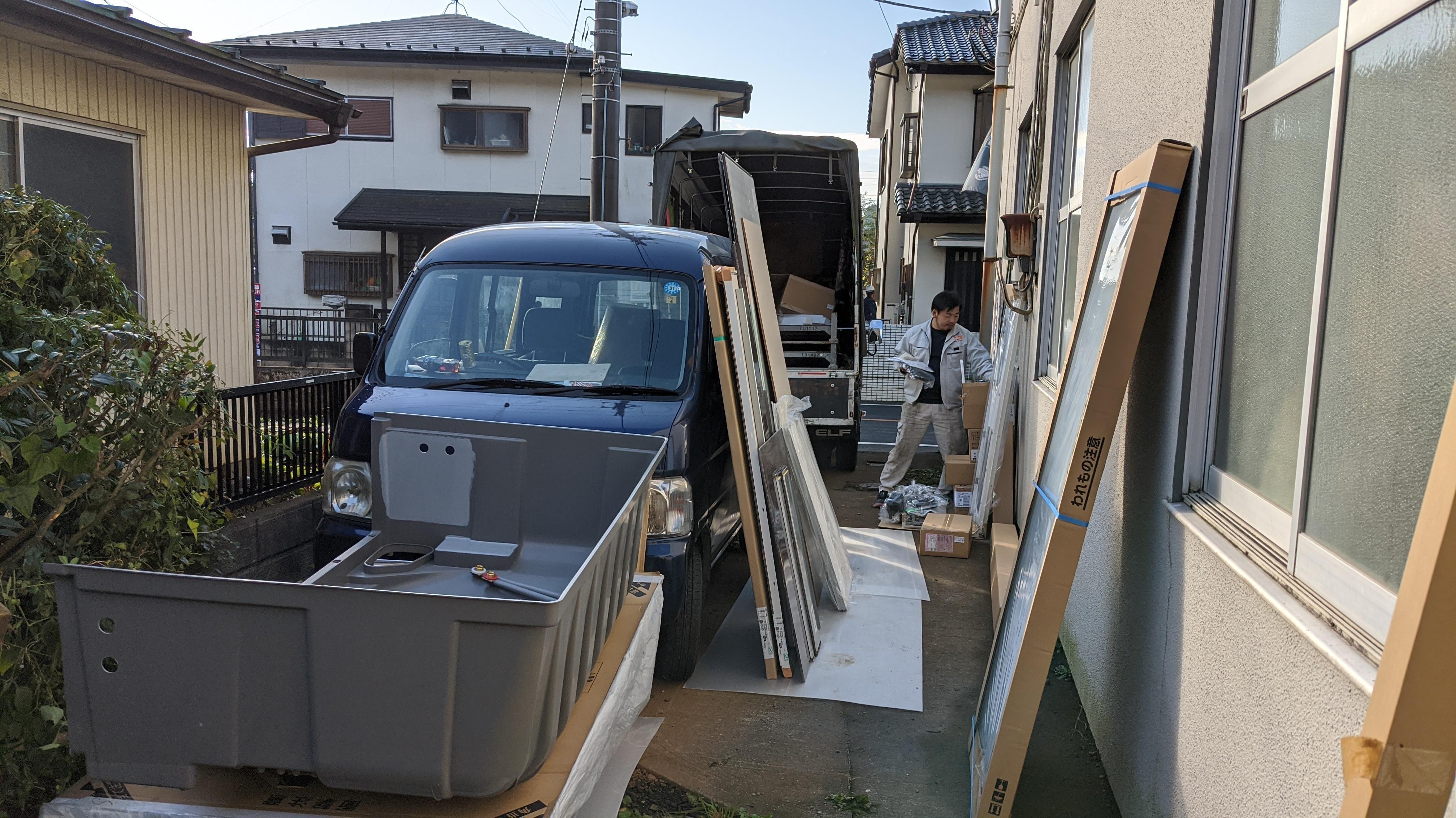 システムバス施工当日朝の準備です。多くのパーツが搬入されてLIXILエンジニアが整理をしています。