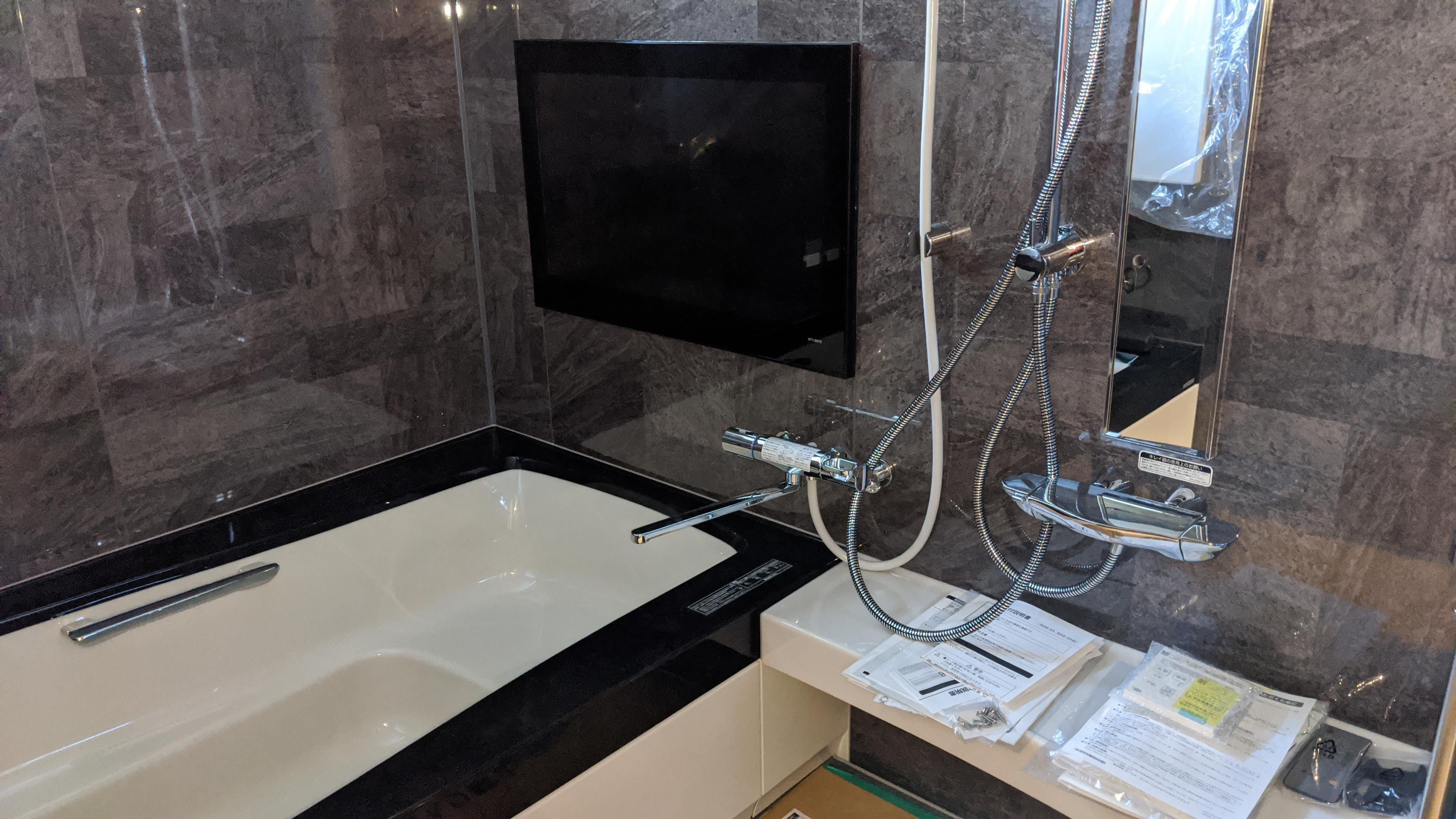 今回のシステムバス特長は大型の液晶テレビやアクアフィールと呼ばれる肩湯です。