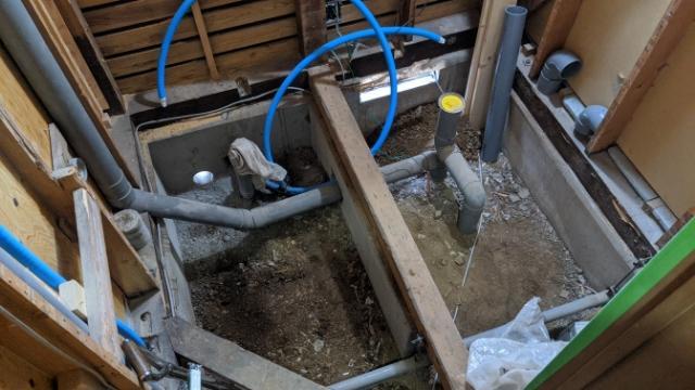 こちらは床を解体した状態です。便所内でかなり多数の配管類が集中しています。