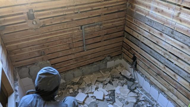 こちらが壁タイルを剥離した状態です。壁には断熱材もありませんので非常に冬寒い環境です。