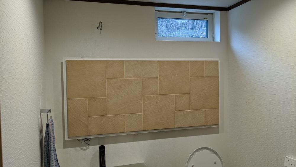 壁面に見えている波模様はLIXIL製の調湿建材エコカラットのパネルです。