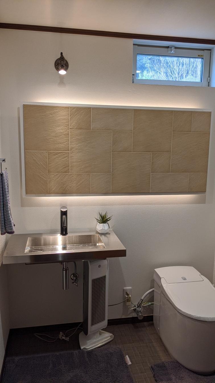 手洗器はカクダイ製のステンレス製・水栓は電池内蔵によりセンサー水栓を採用しました。