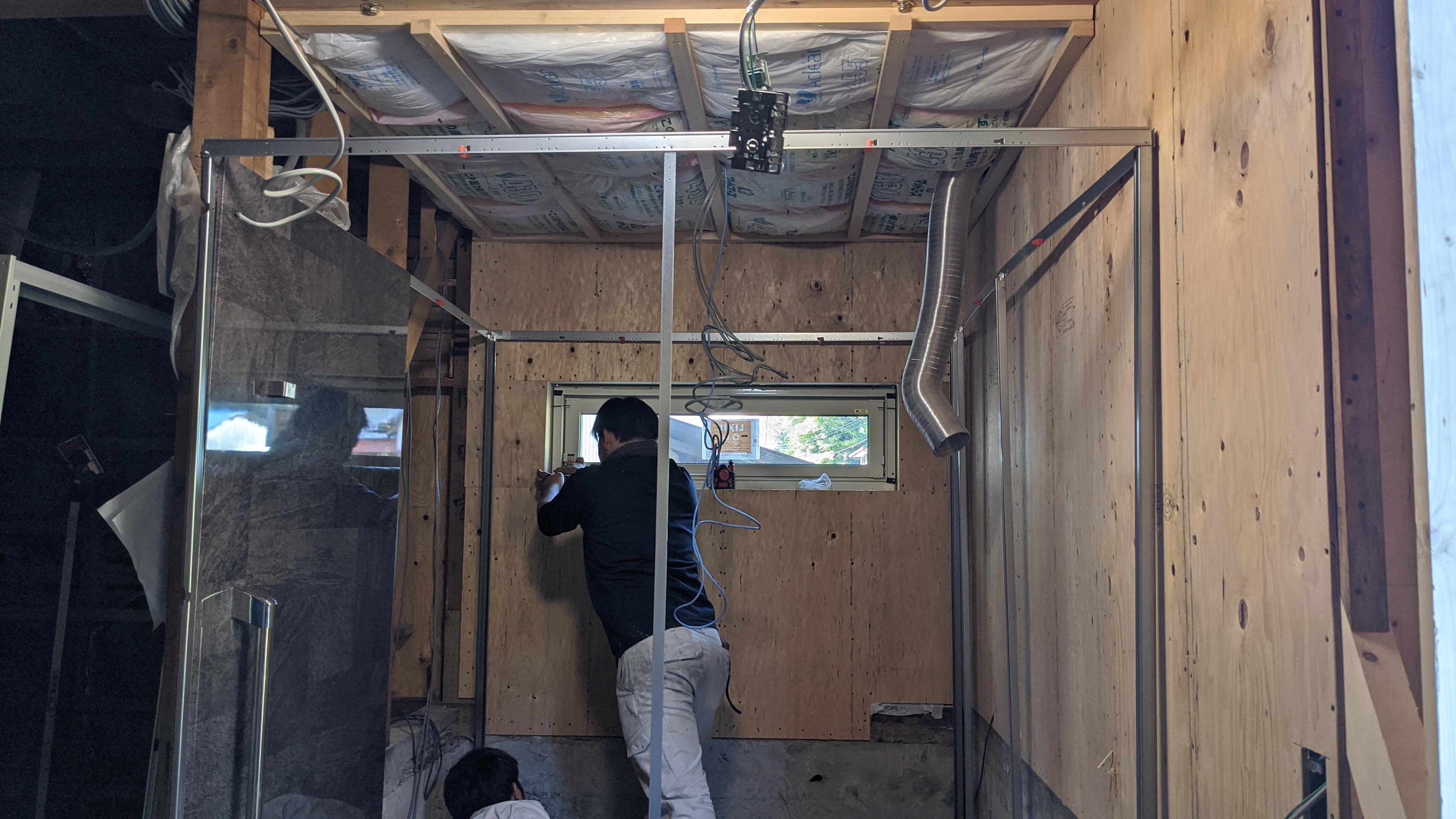 以下の事例でご覧いただくと木造の空間内側に箱形状に浴室が仕上がりますので