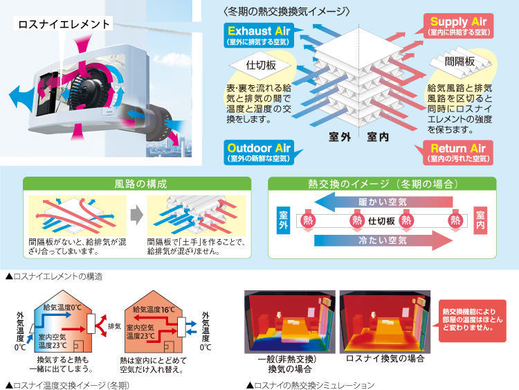 ロスナイ換気扇は換気扇内部で温度差を変えない仕組みになっています。