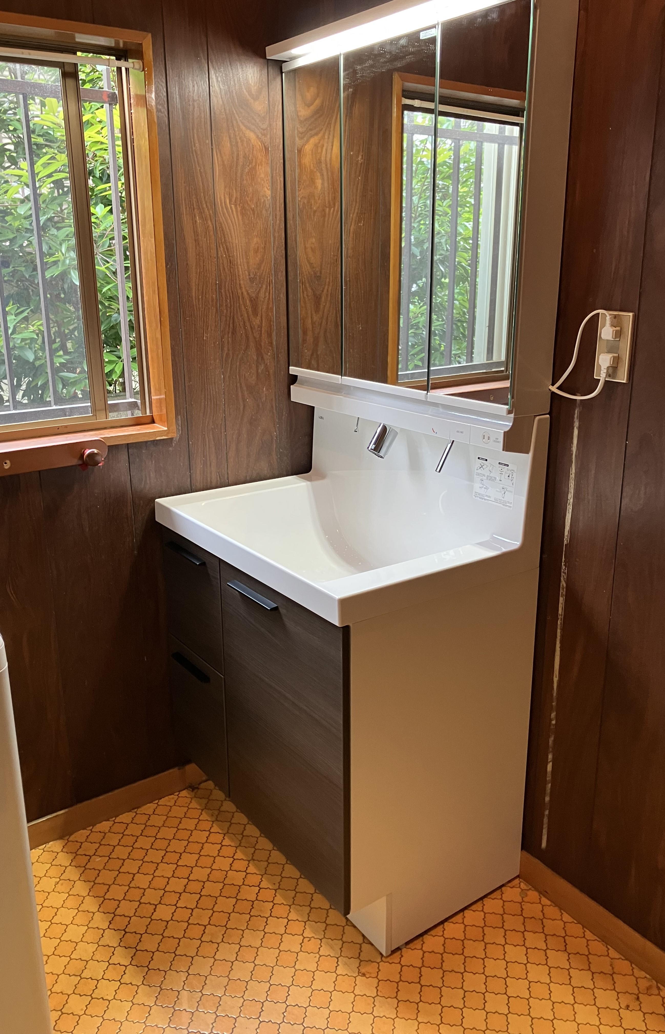 洗面台が古くなり、物が溢れてしまったため、断捨離を行いつつ新しいものに取り替えました。お客様の要望に応じて、周囲をすっきりと整理できるように収納スペースが多く、三面鏡の裏にも収納可能なクレヴィに交換となりました。