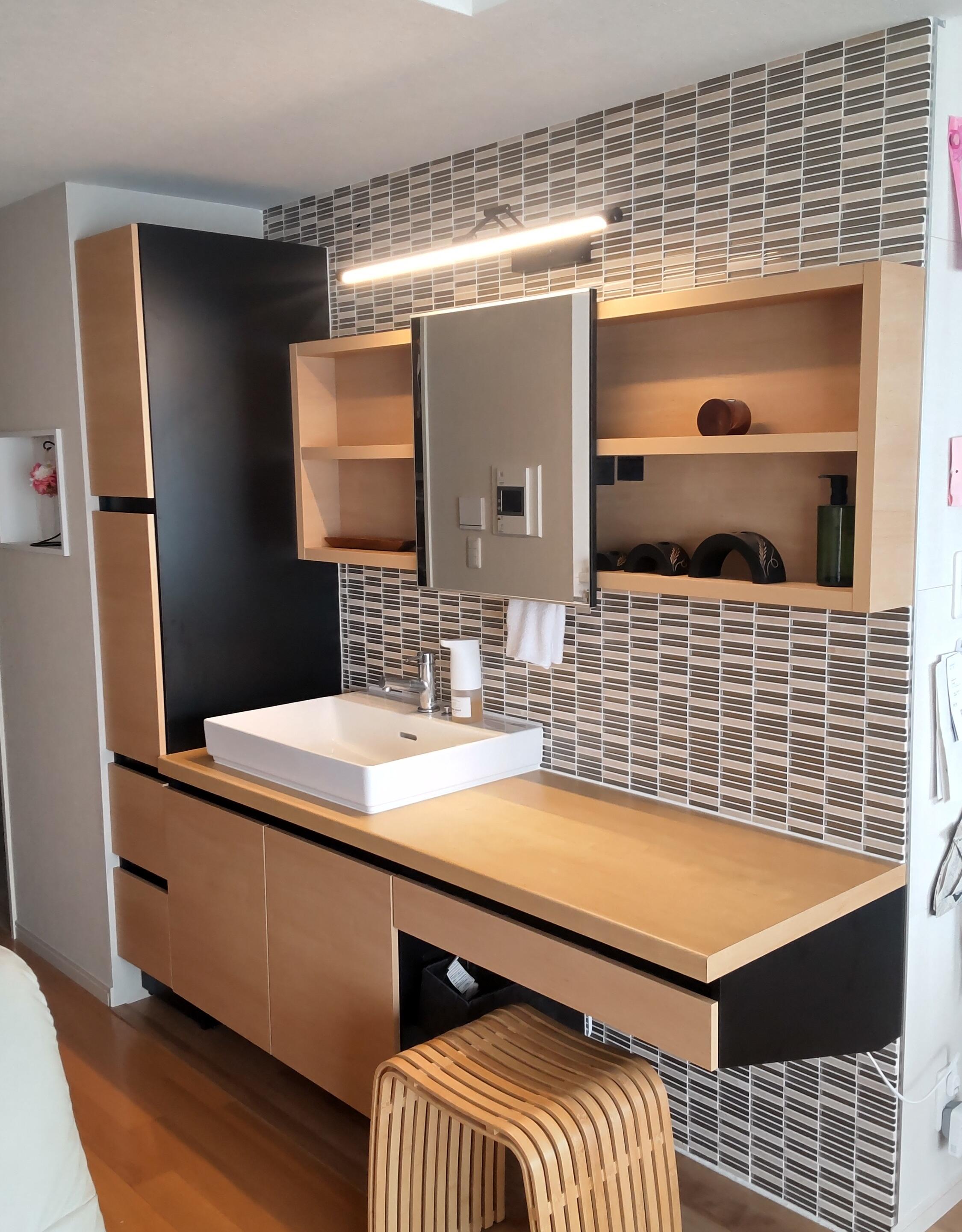 お客様が来た時にも、手洗いをさりげなくすすめられるそんな空間にとても満足しています。 リビングの入口にあるので子供たちも手洗いをすすんでやってくれるようになりました。 大理石とガラスでできたタイルはキラキラとして洗面台の前に立つ度に工事をお願いしてよかったと感じています。