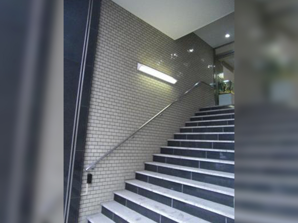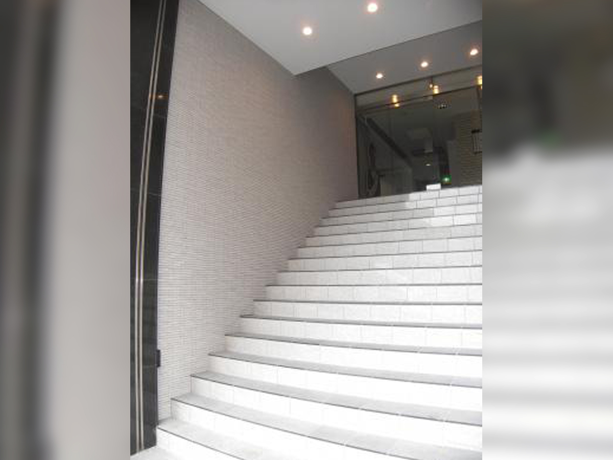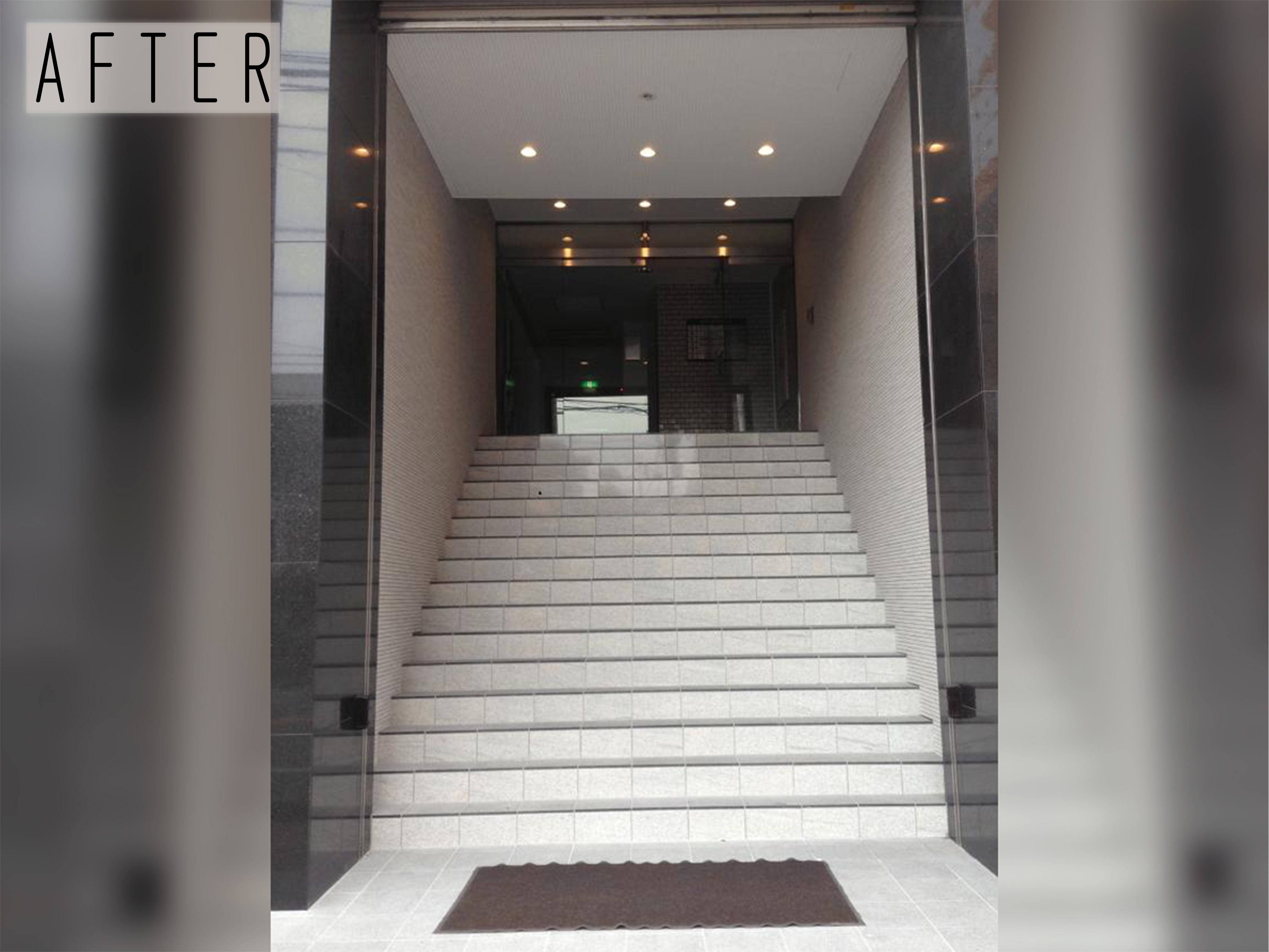 壁は既存タイルの上からタイル張りで、階段は張替ました。 照明器具も壁付けからダウンライトに変更し、天井も白く塗装。 空間が明るくなり、まるでホテルのエントランスのような雰囲気に変わりました。