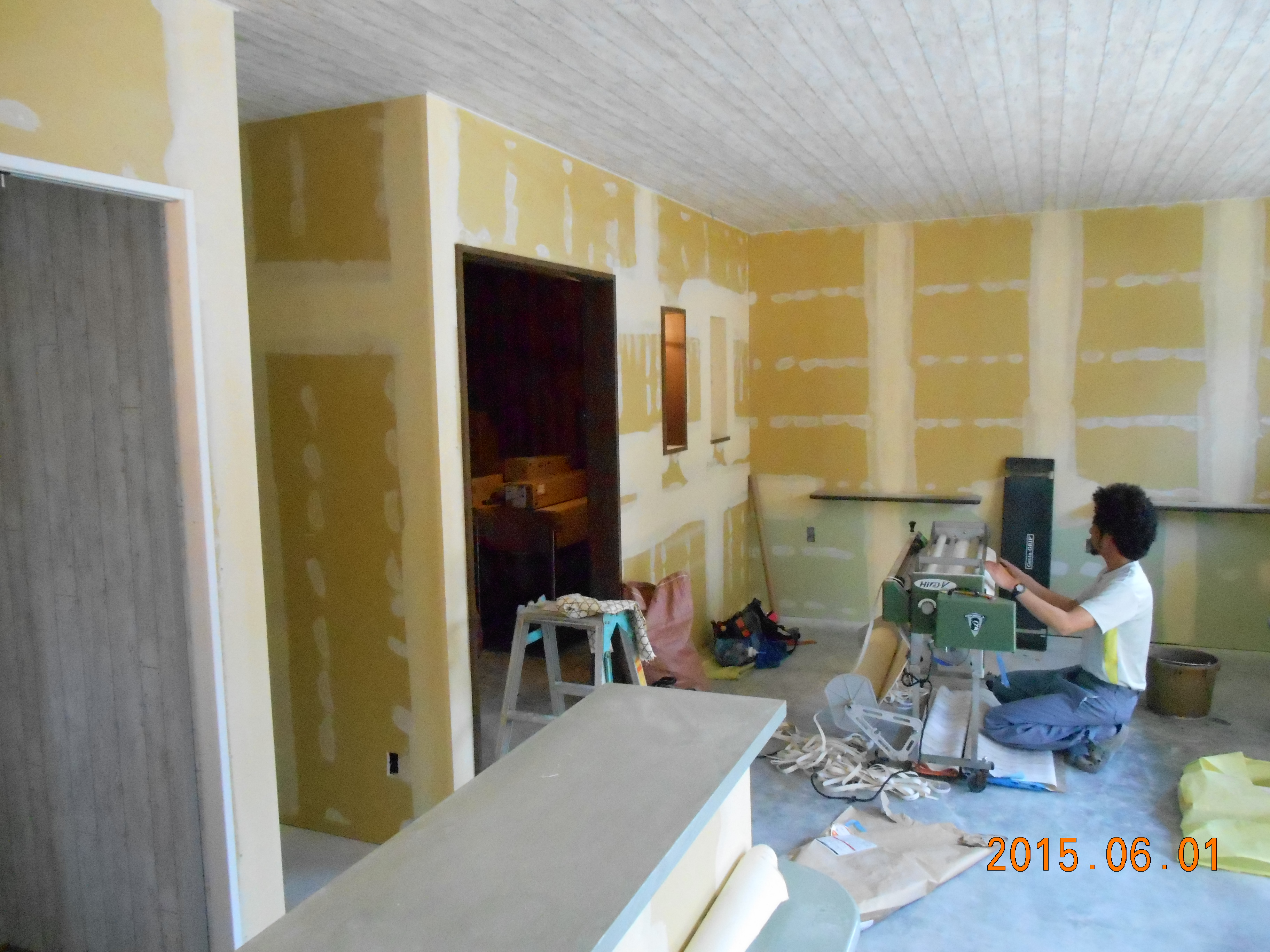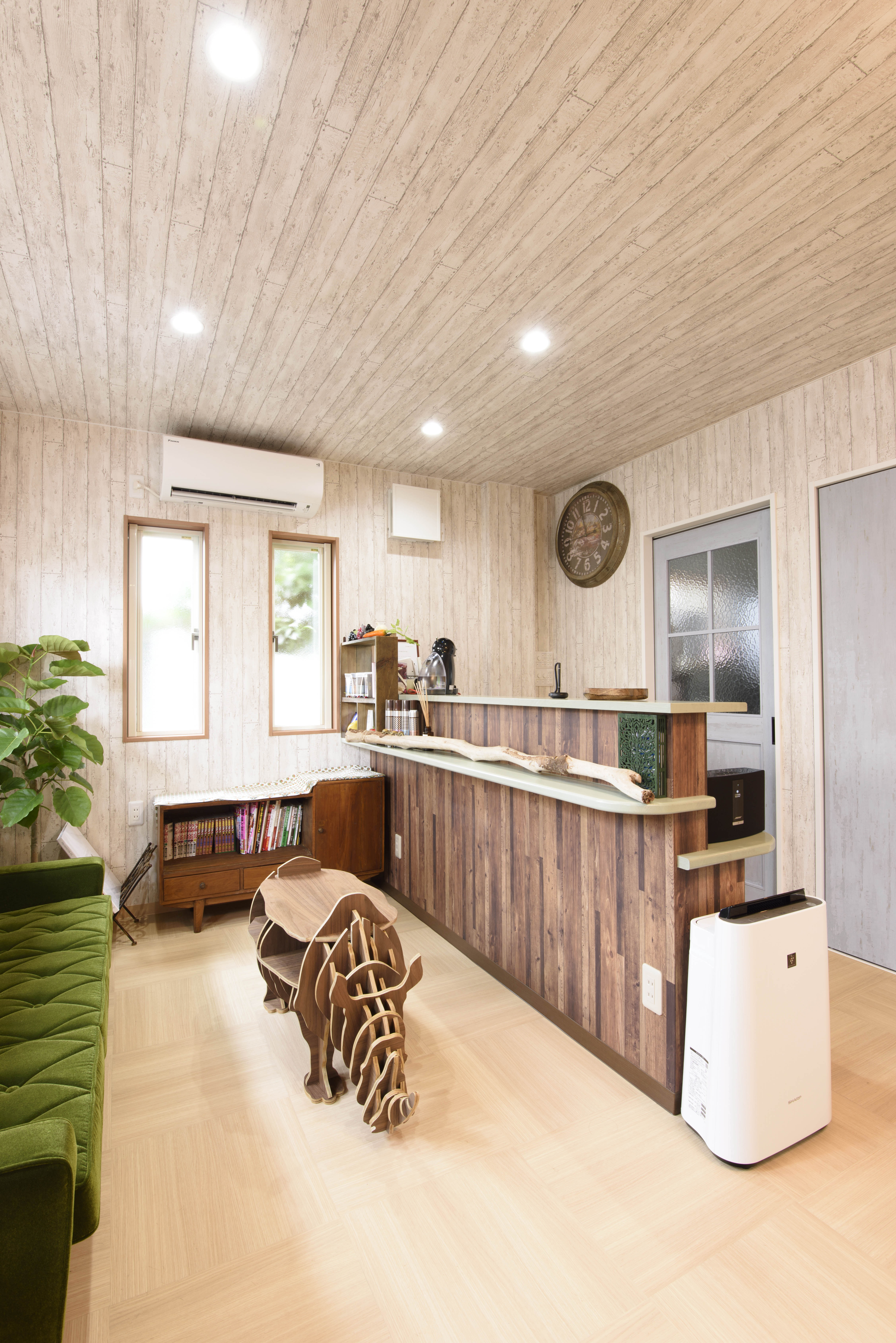 天井、壁と木目柄で柄を合わせるのが非常に難しいけれどピッタリと合わせて張ってくれました。
