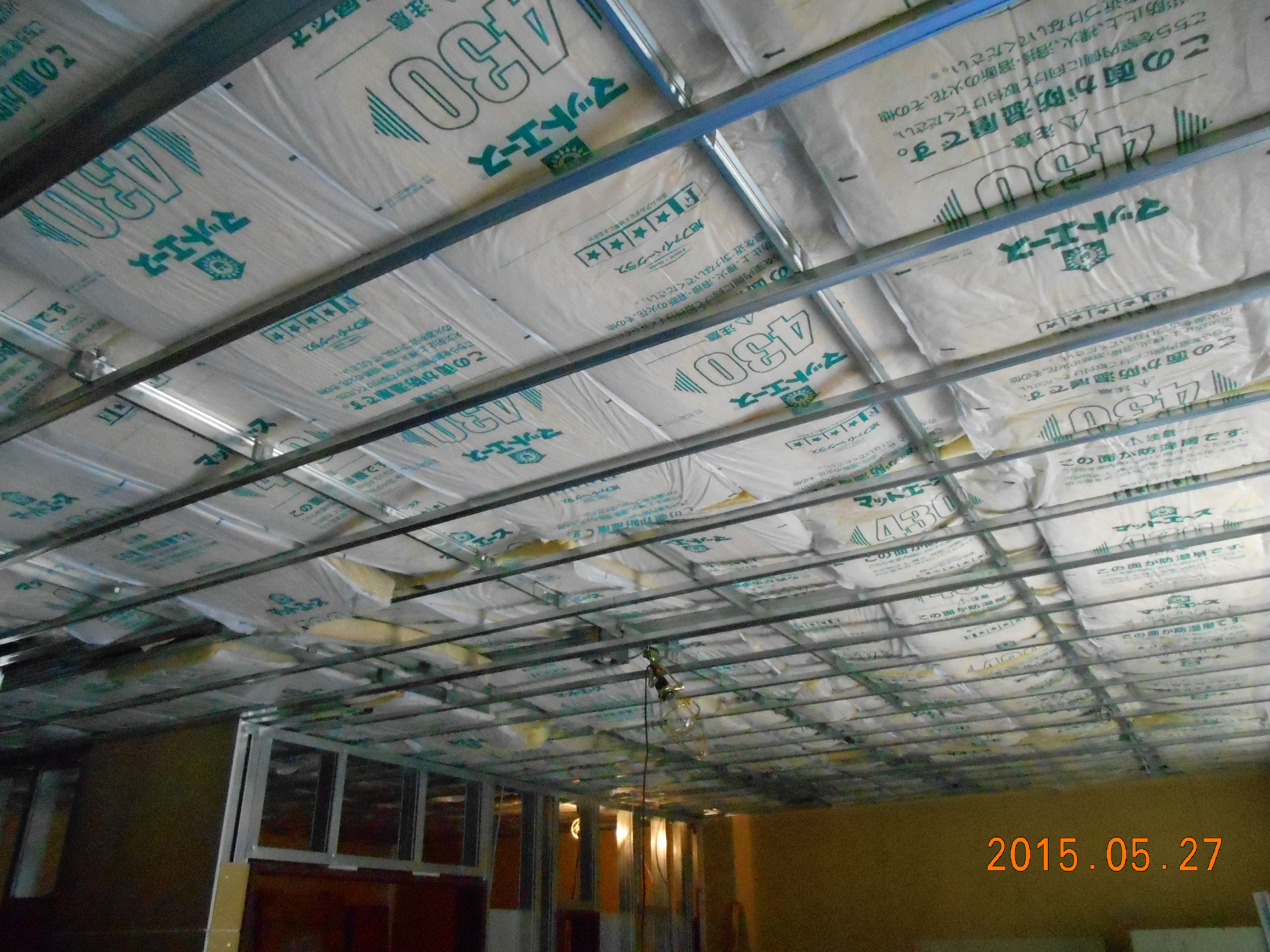 断熱材施工状況です。天井、壁断熱材はグラスウールを使用しています。小さな隙間も押出ポリスチレンフォームの断熱材を入れ込んであります。全体を覆うような形で断熱材を施工していきます。