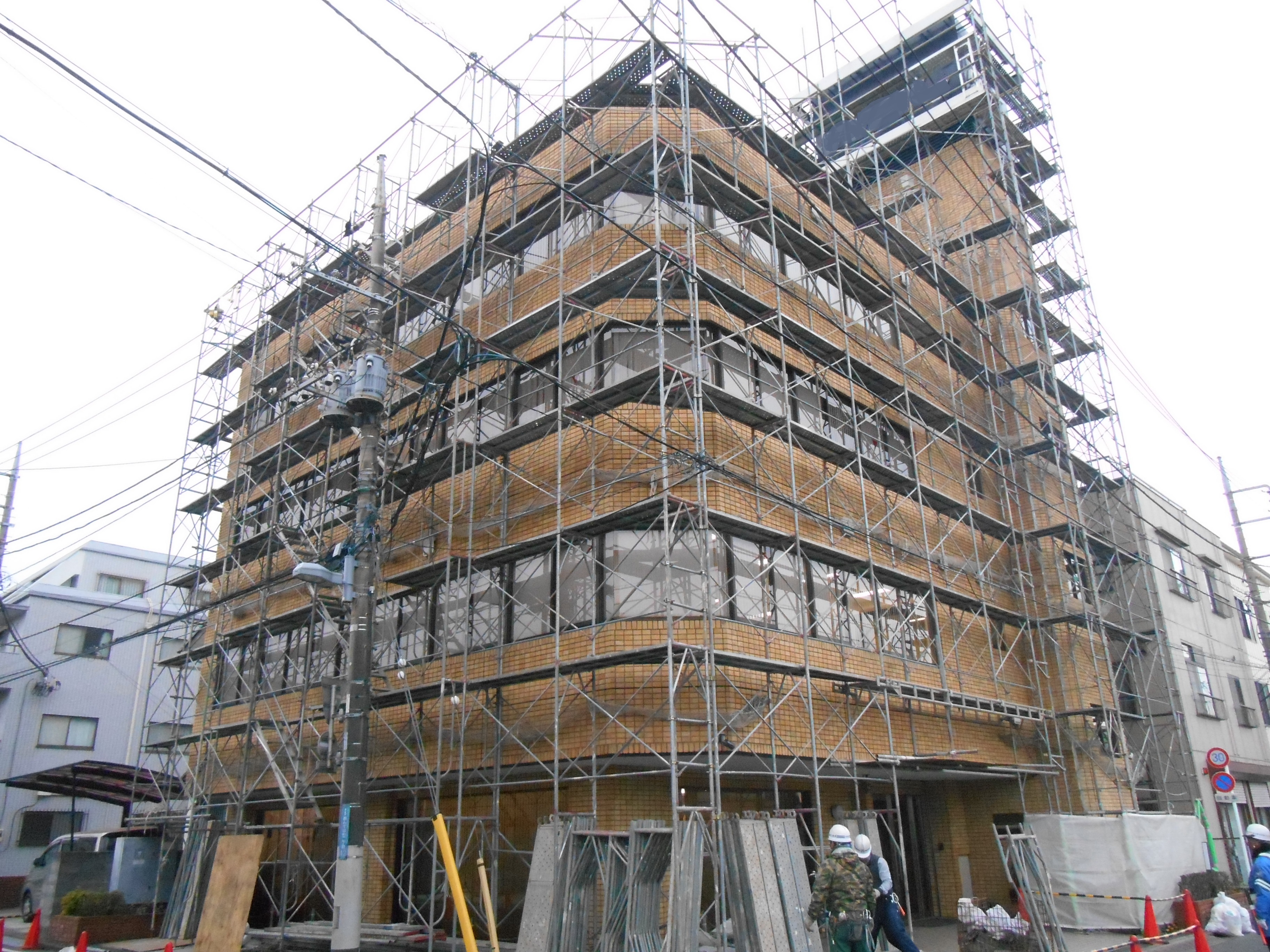 4階建てのビルに足場を立て、外壁のタイル洗浄を行いました。サッシまわりは雨水による漏水を防ぐため、浸透防止剤を塗布しました。不良タイルを1枚1枚確認し、1部張り替えました。
