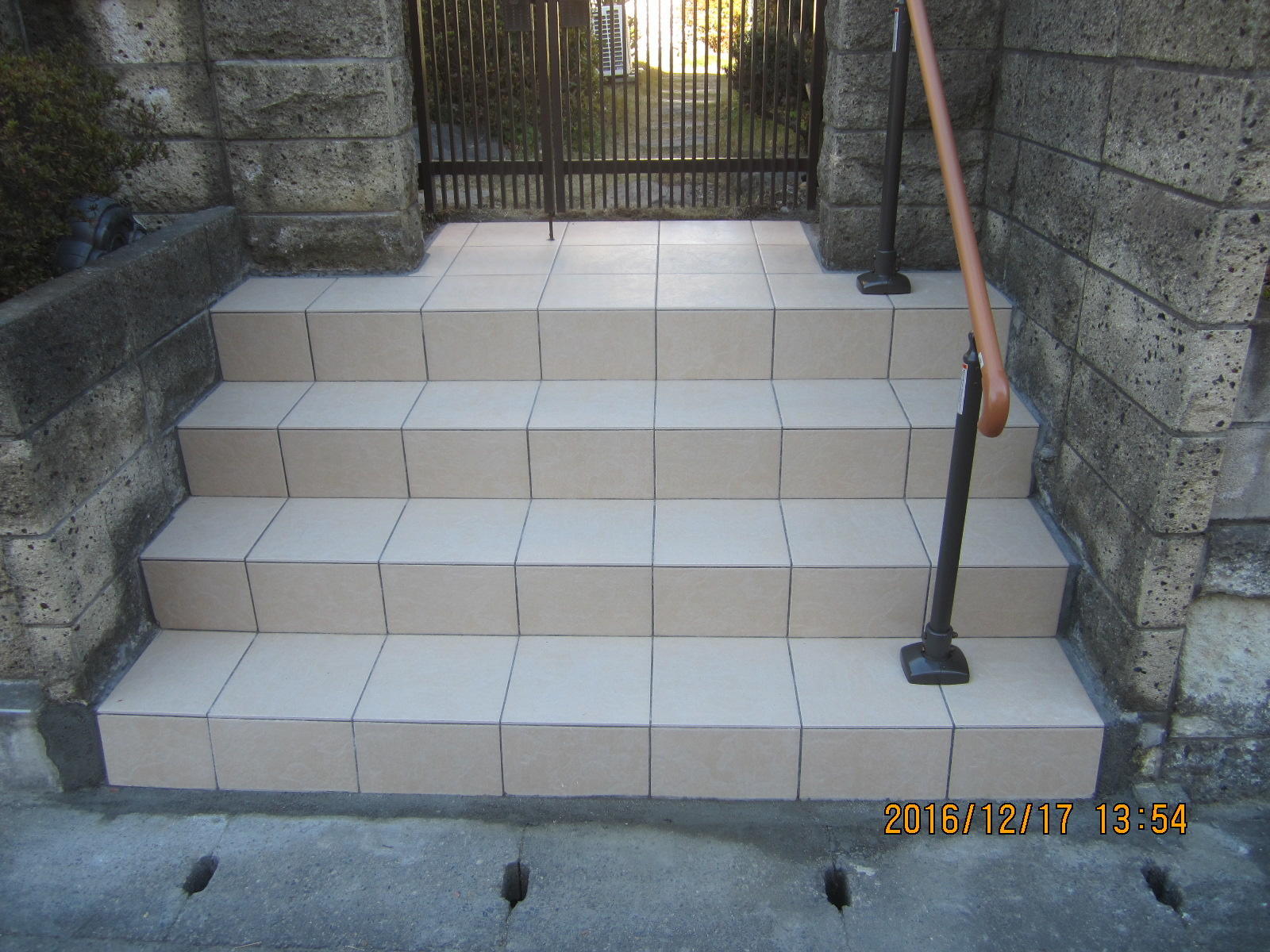 モルタルのエントランスが古くなり、汚れが目立つ様になったので、タイルを貼る事にしました。新規で手すりを設置したので、階段の登り降りがとても楽になりました。タイルを新しくしただけで、見違える様にキレイになりました!