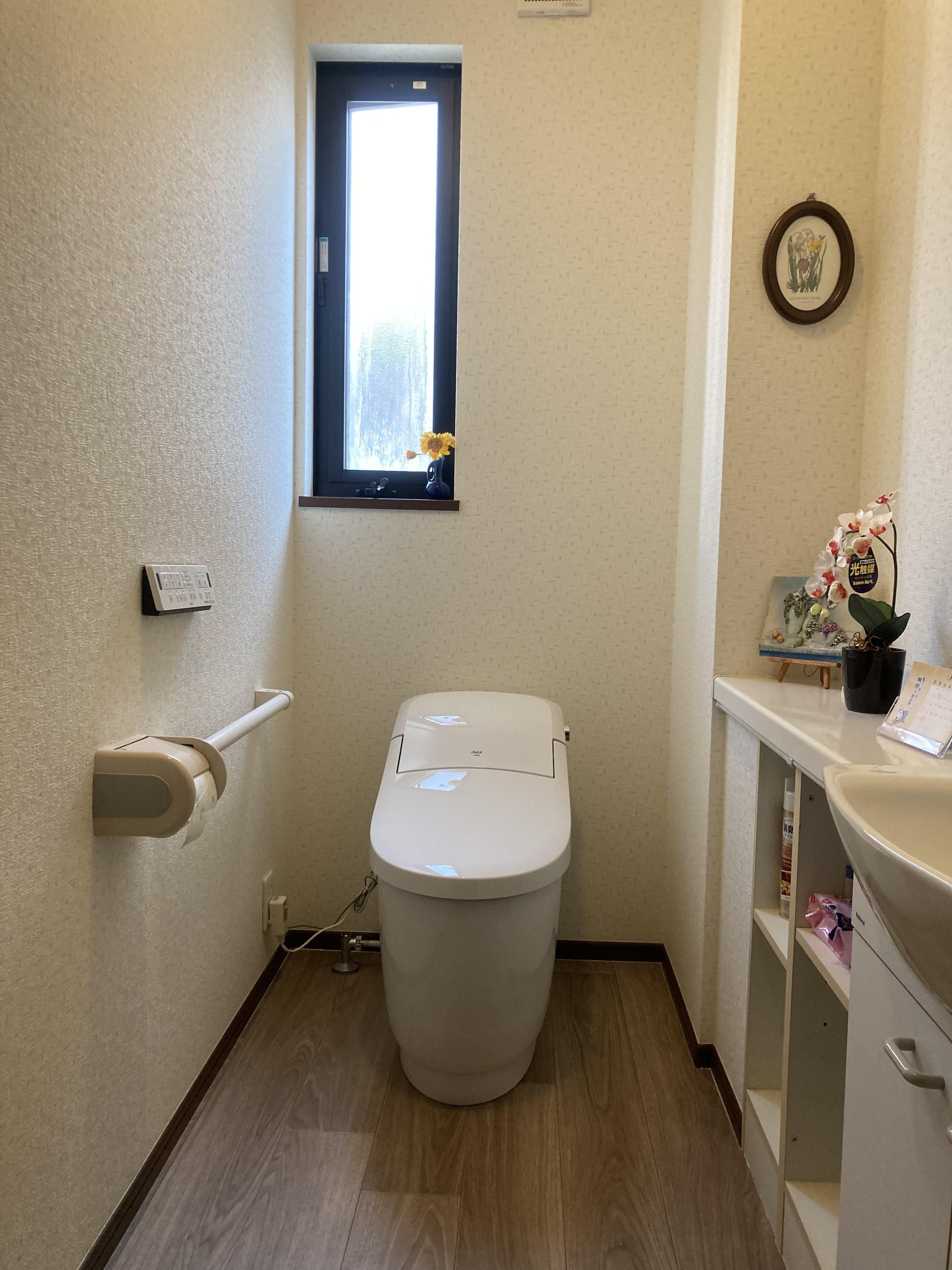 トイレ空間を広く使いたかったので、タンクレストイレに交換しました。商品は、LIXILショールームで実際のデザイン、カラーを確認したので安心してリフォーム出来ました。クッションフロアは、ダークな木目に貼り替えたので落ち着いた全体の雰囲気が気に入っています。 見積もりから工事完了までの対応がとてもスムーズで大変満足しています。