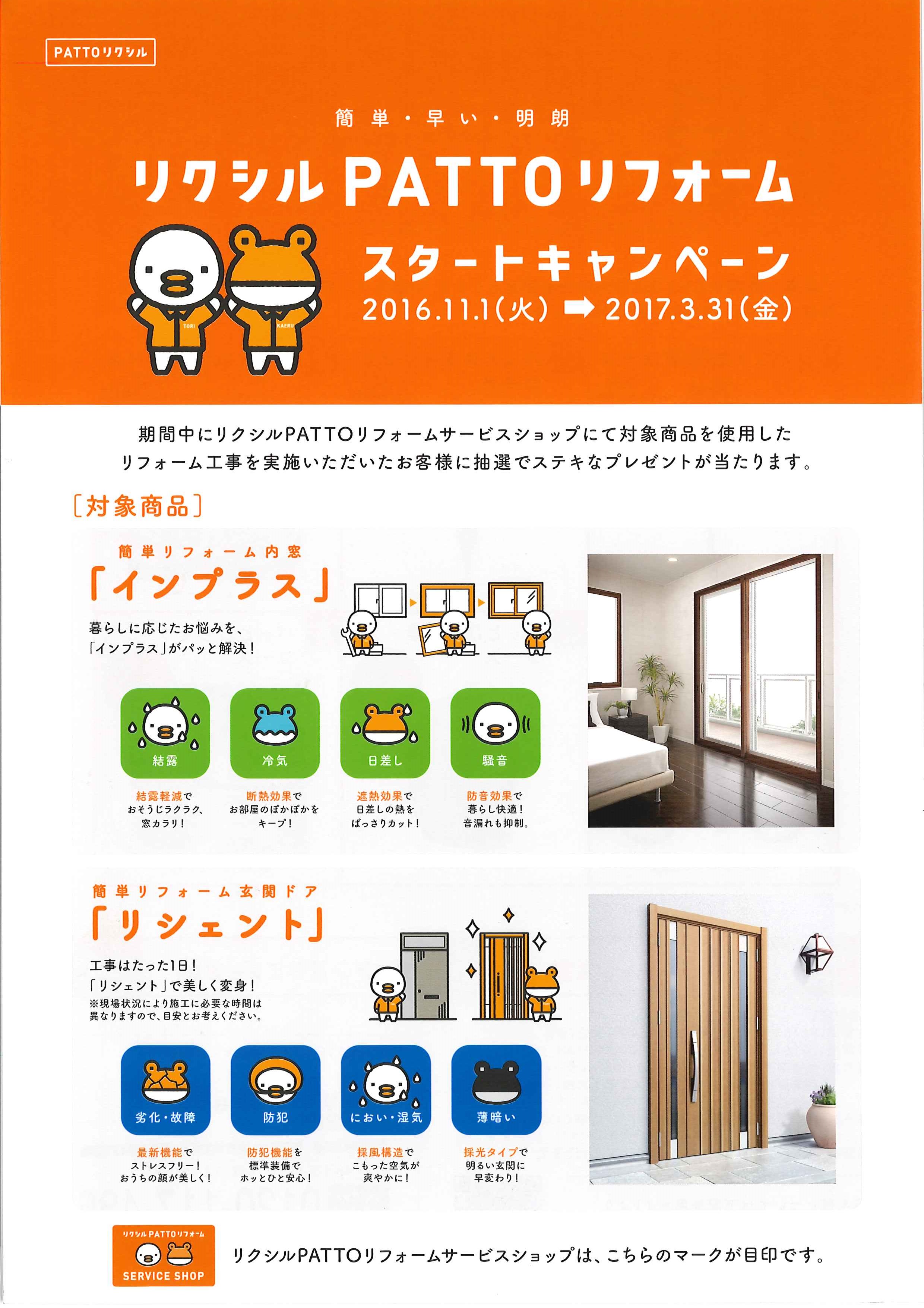 期間中にリクシルPATTOリフォームサービスショップにて対象商品を使用したリフォーム工事を実施いただいたお客様に抽選でステキなプレゼントが当たります。