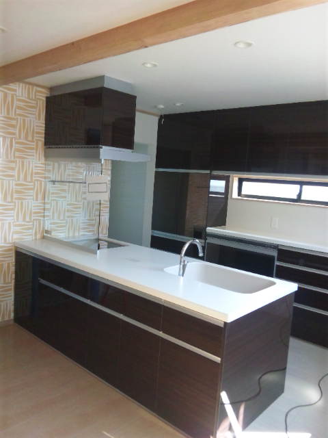 ↑開放的なオープンキッチン。背面は一面に収納ユニット。