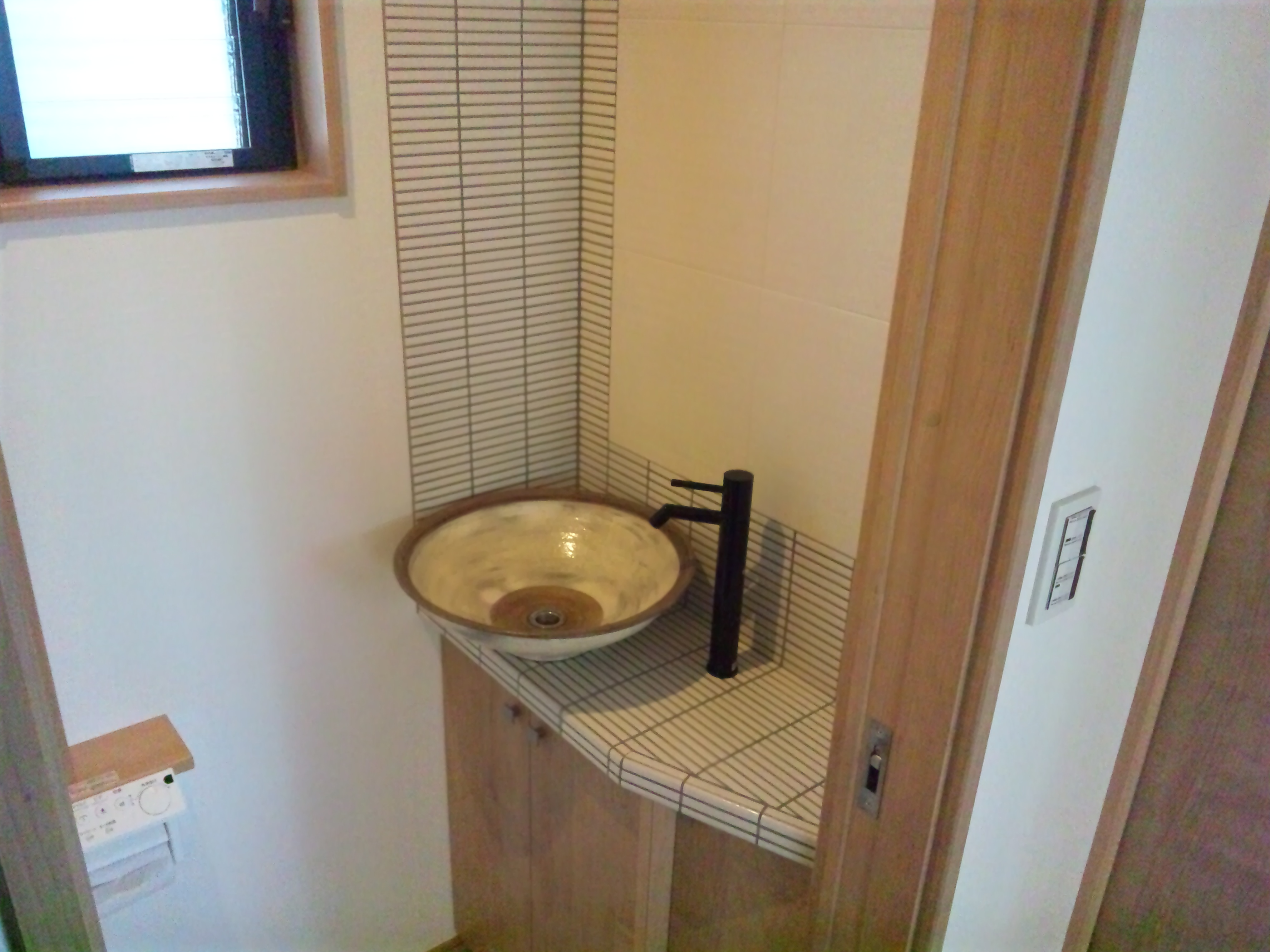 趣のある手洗いボウルとカウンタータイルで空間を演出