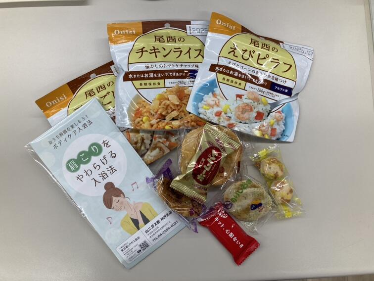 入浴セミナーでご説明のあった入浴剤や先着のアルファ米、