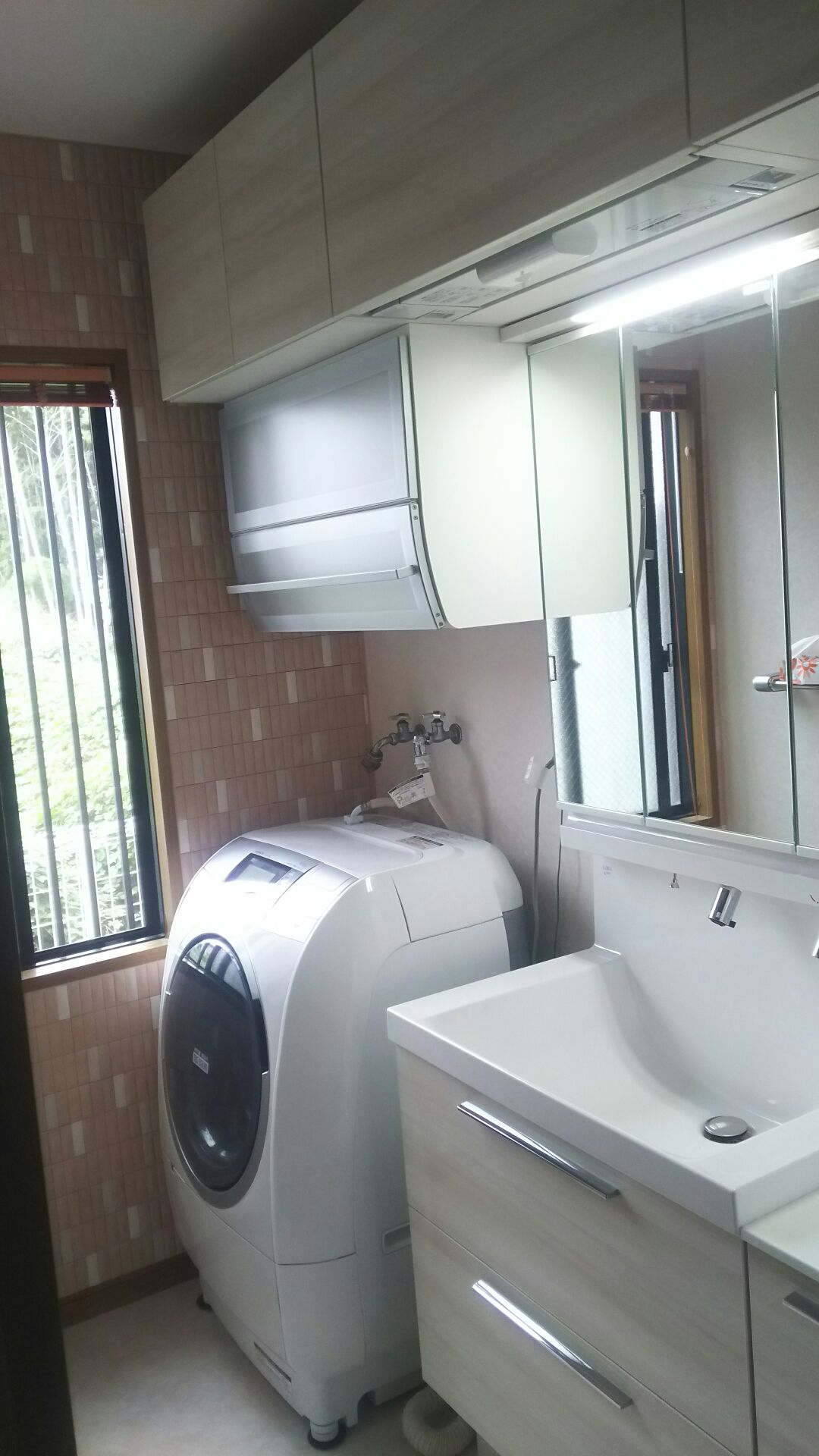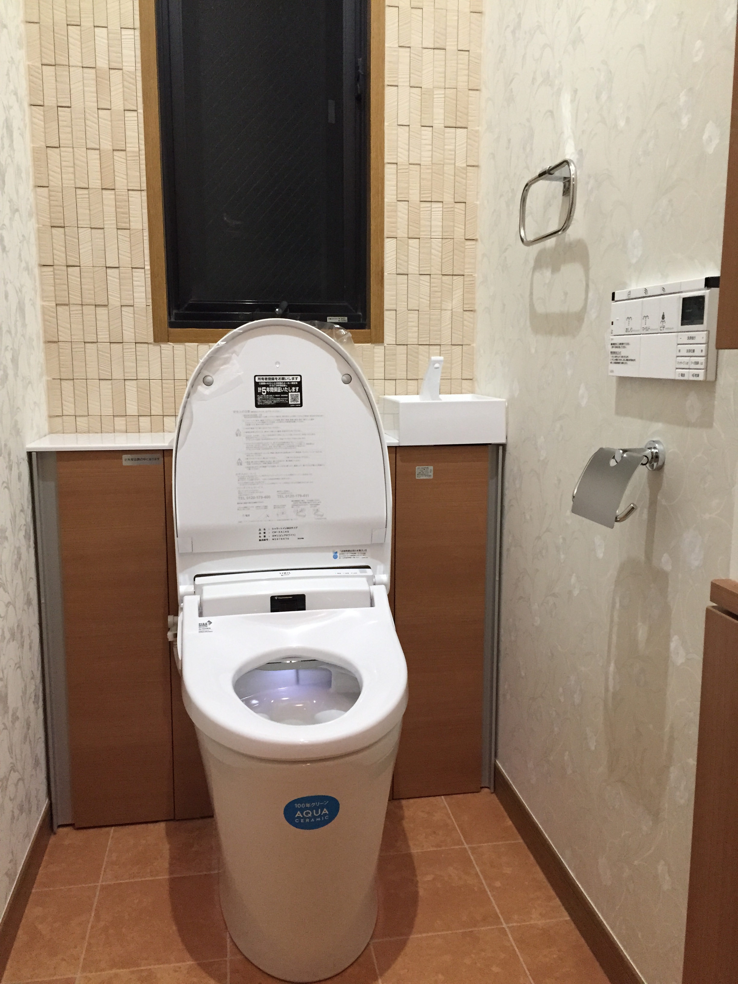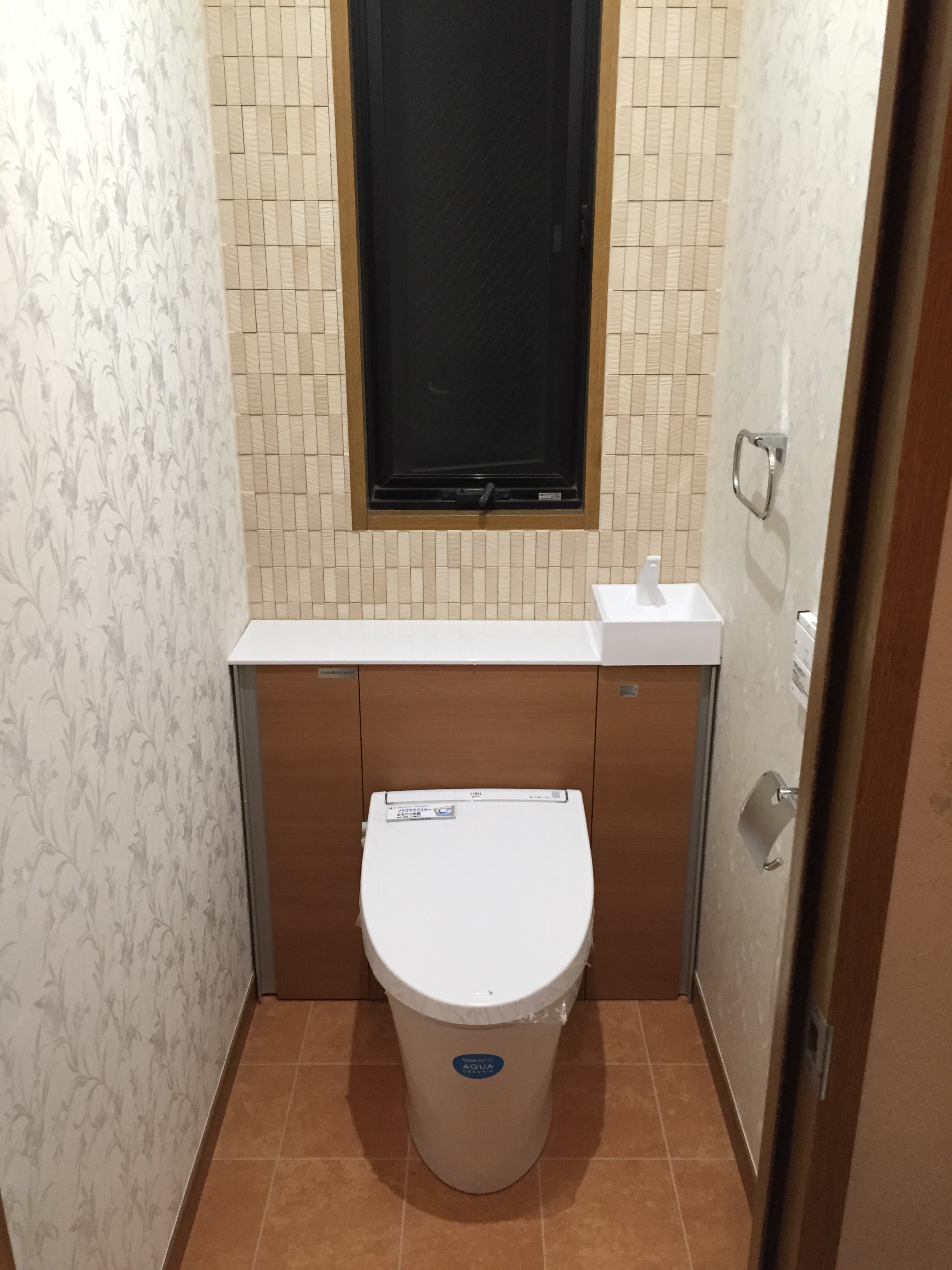 トイレの水漏れをきっかけにお問い合わせをいただきました。最新のアクアセラミック素材が採用されたトイレなので、簡単なお掃除できれいな状態が長く保てます。洗面所のリフォームも同時に行い、上部に新たに収納を設けたため、使い勝手も向上しました。