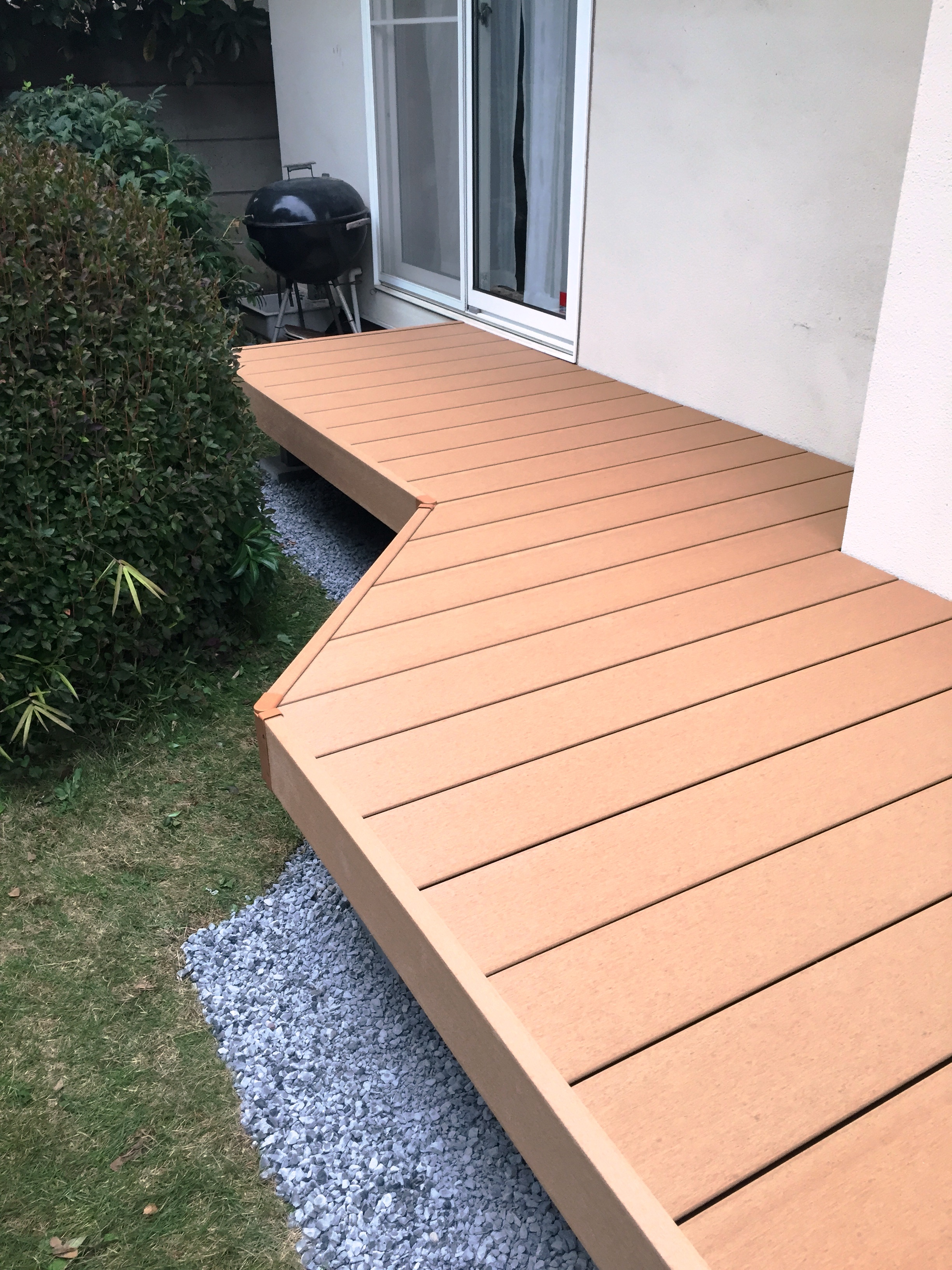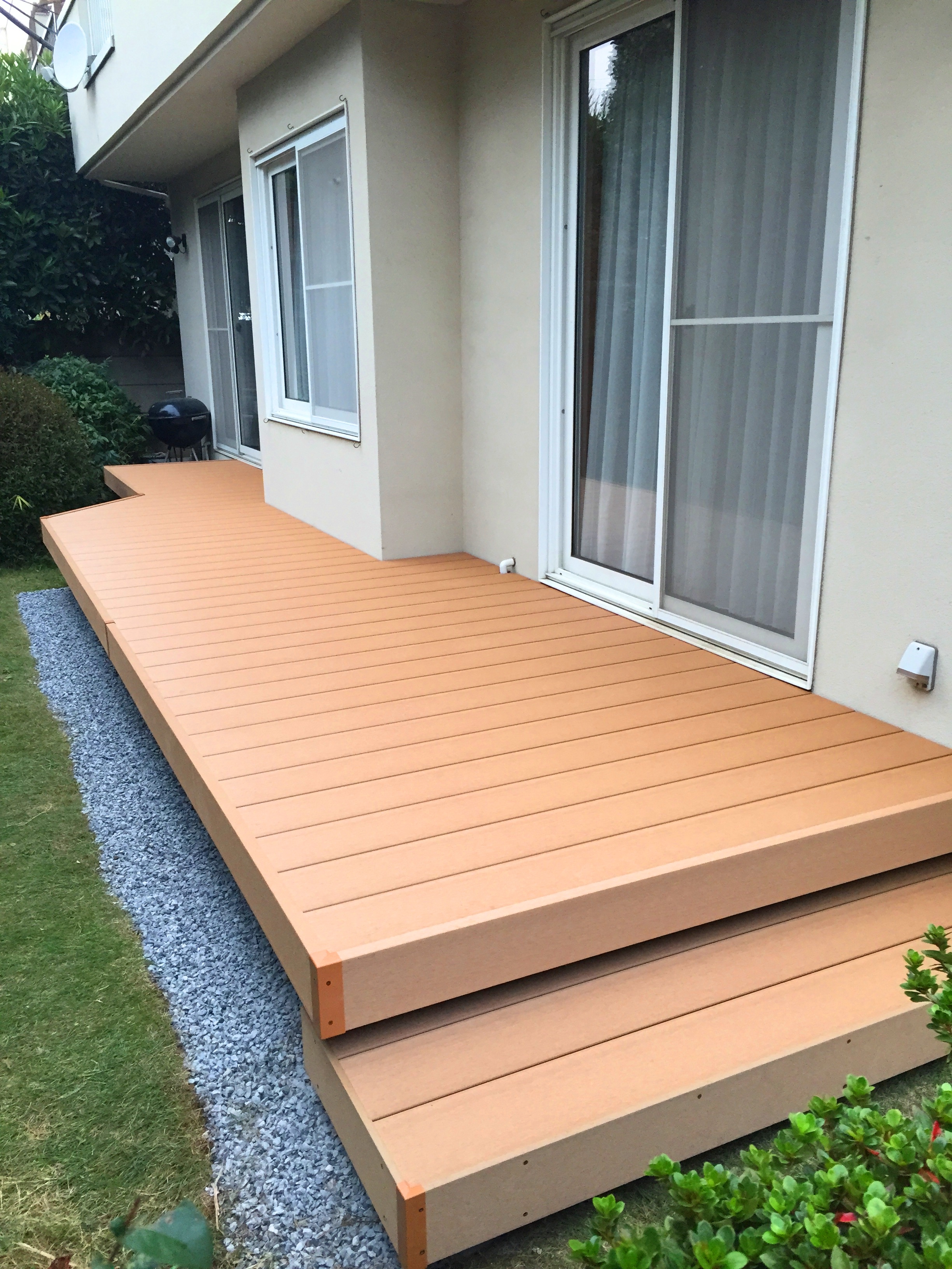 ウッドデッキを設置しました。お庭の中に新たなフロアができ、ゆったり居心地の良いスペースとなりました。高性能な板で、設置後のお手入れも簡単なLIXILの樹ら楽ステージをご提案いたしました。