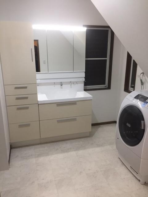在来のお風呂から暖かいユニットバスへ変更しました。洗面室は収納たっぷりの棚と大きなシンクの洗面台で機能的で広々とした空間になりました。