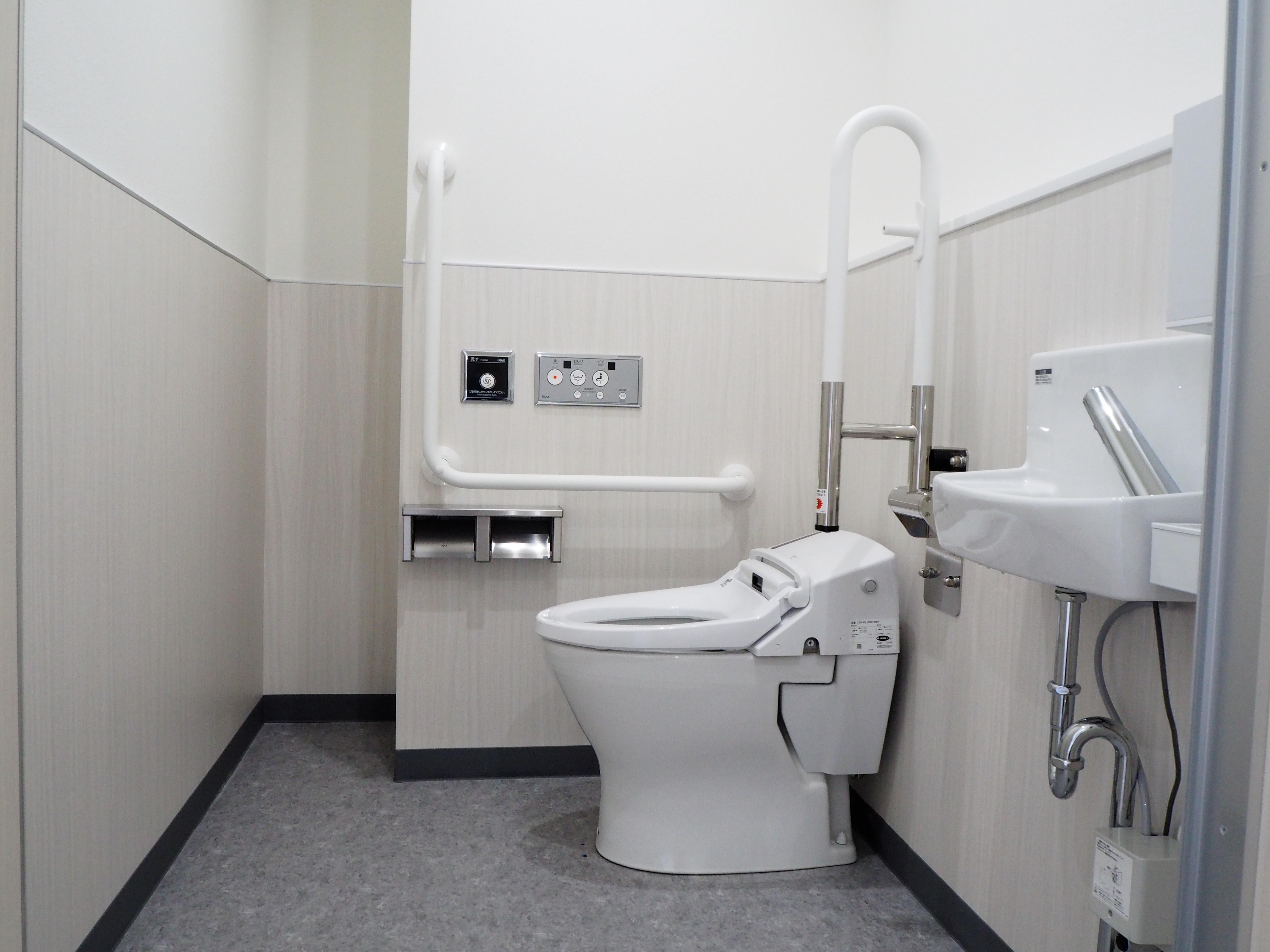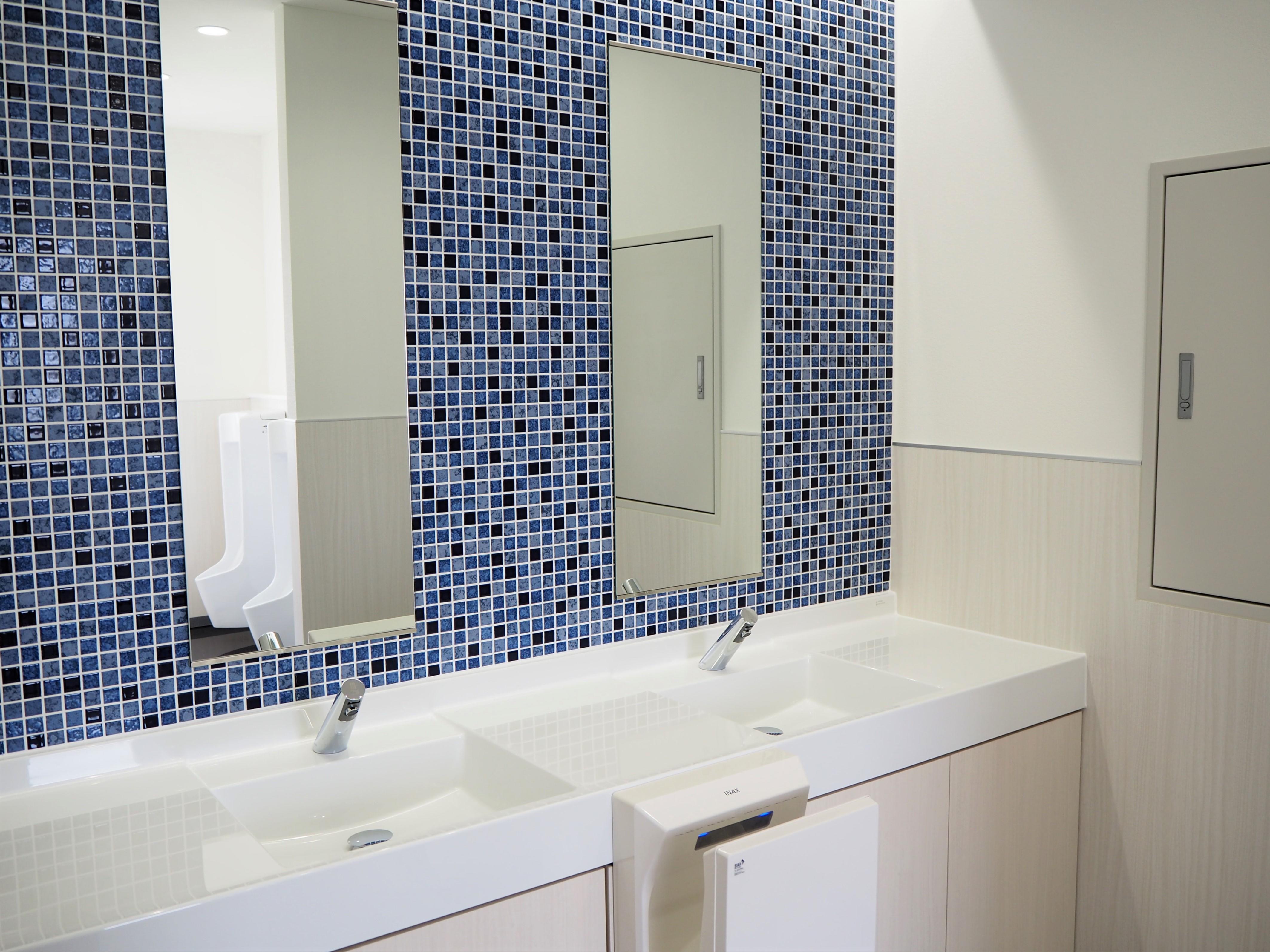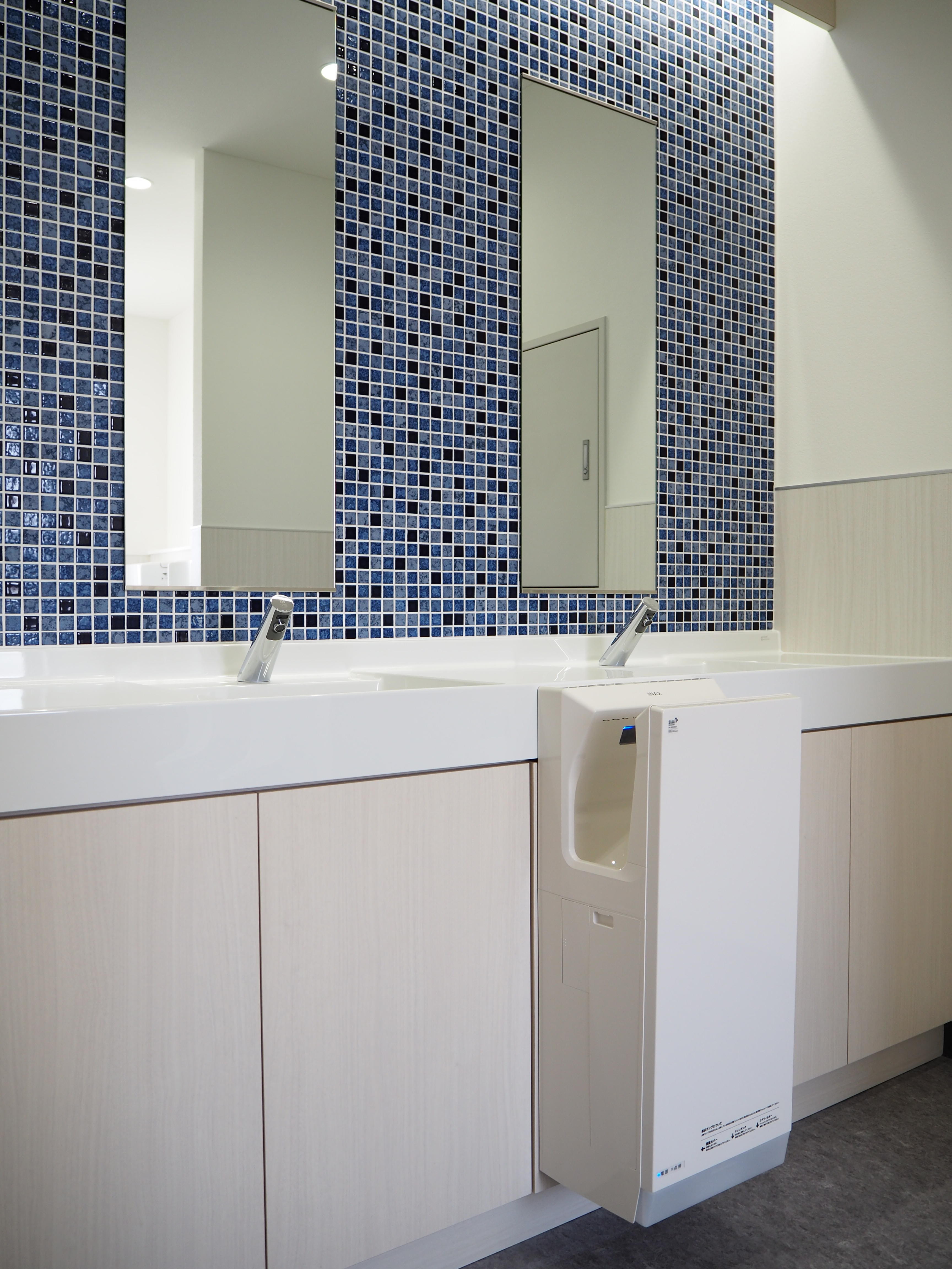 社内外、国内外から多くのお客様が来社利用する管理棟3階フロア―のトイレを、竣工以来初めて全面改修しました。 管理棟で1階に1つしかなかった多目的トイレを、2つあった男子個室ブースを1つにして男女問わず利用できる多目的トイレとして新設しました。 図面上では、「少し窮屈かな?」と思っていましたが、車いすでも十分ゆとりのあるスペースが確保できました。 打合せを開始し完成まで約1年3か月、提案から施工・施工管理とコミュニケーションも十分とれ、明るく清潔感のある、特に洗面台周辺・パウダールームのタイル貼り施工はとても新鮮で、利用された方からも良い評判をいただく自慢のできるトイレに仕上がりました。