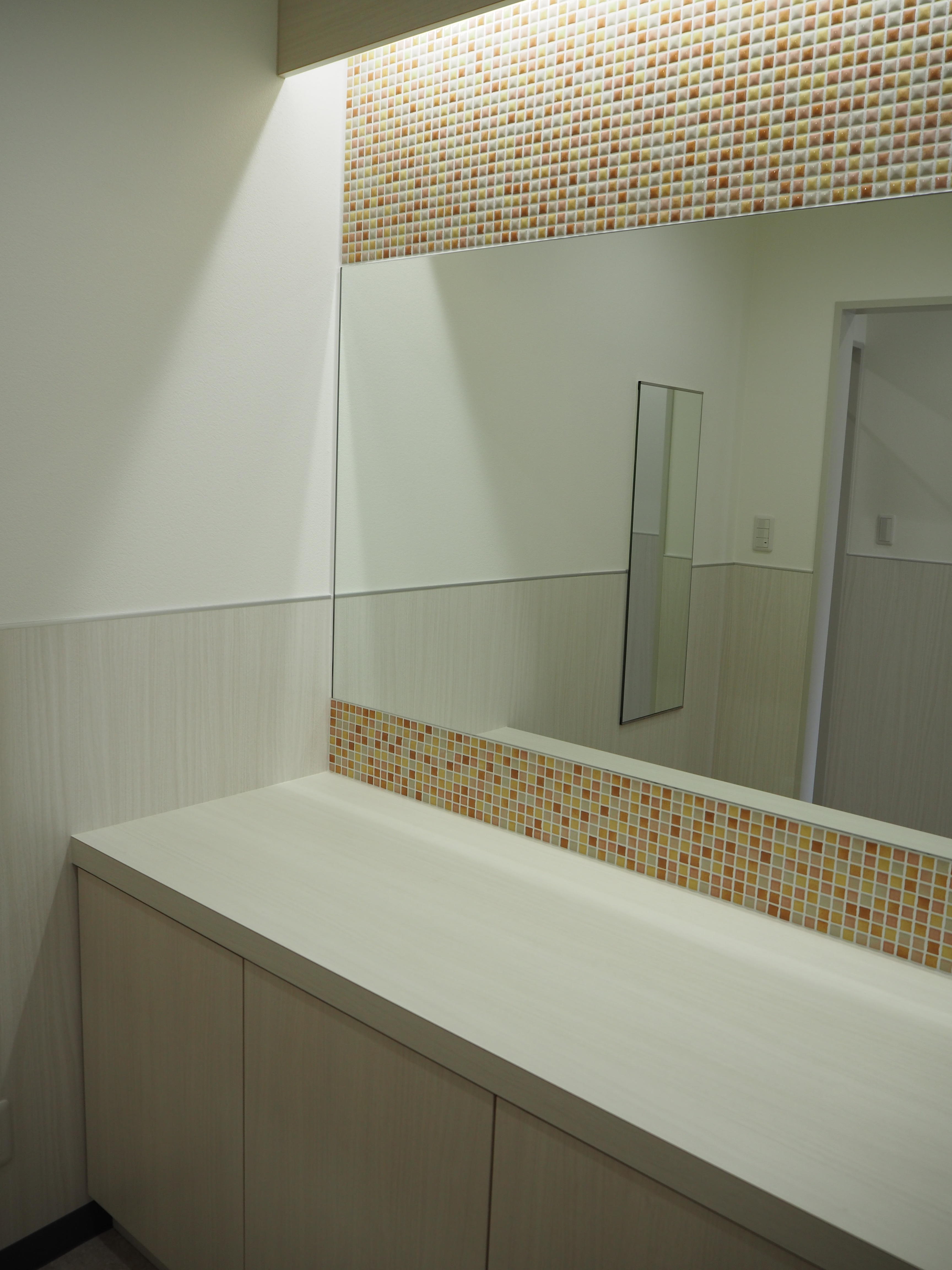 この度はトイレ改修工事を担当させていただきありがとうございました。 お施主様からのご希望が明確であったため、お打合せ段階からスムーズにお話しすることができました。 また、モザイクタイルや間接照明により高級感を演出しました。 勤務者の方へはもちろん、来客の方へも快適なトイレルームになったと思います。