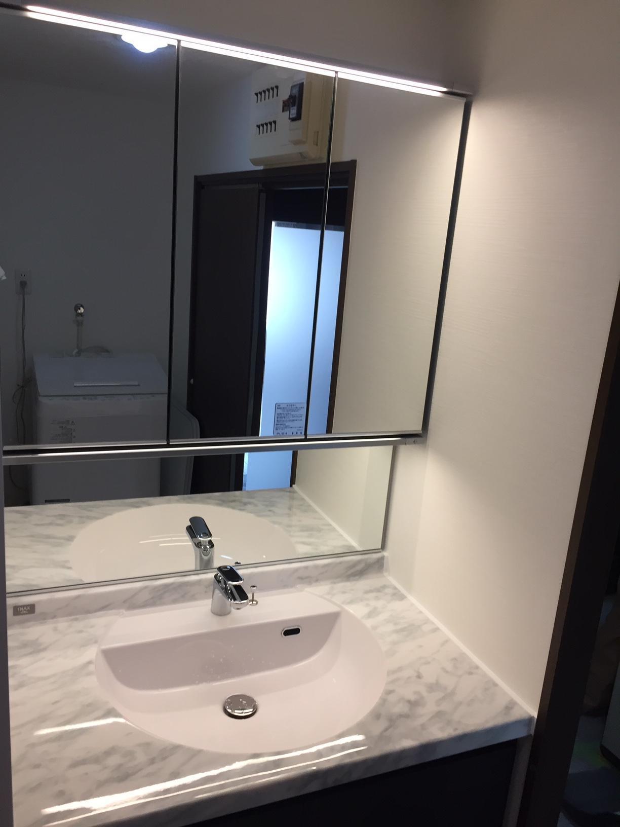 高級感のある洗面ボウルとすべてを収納できる三面鏡ですっきりと大人の空間になりました