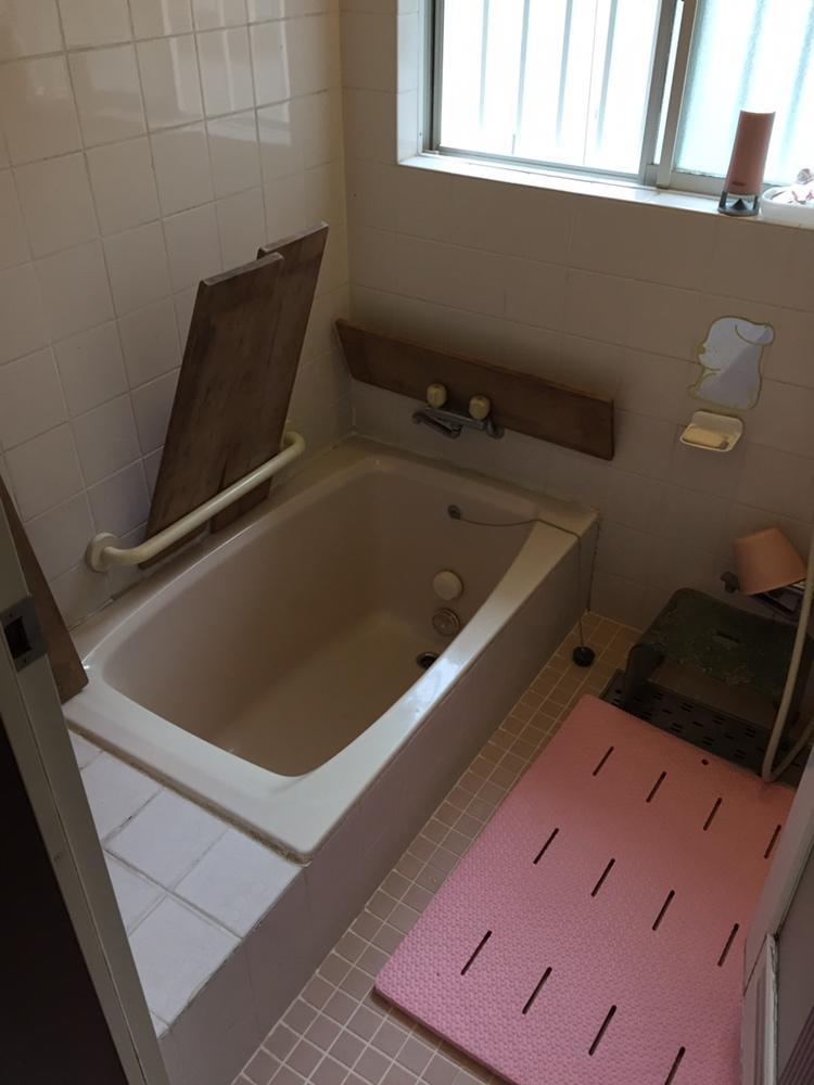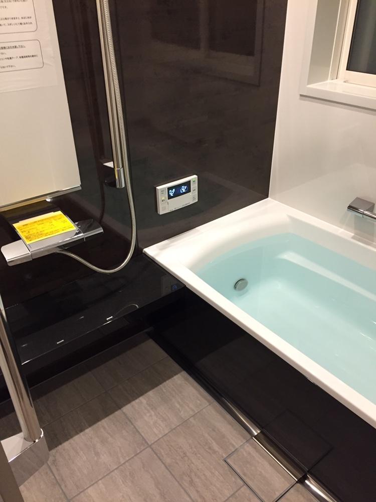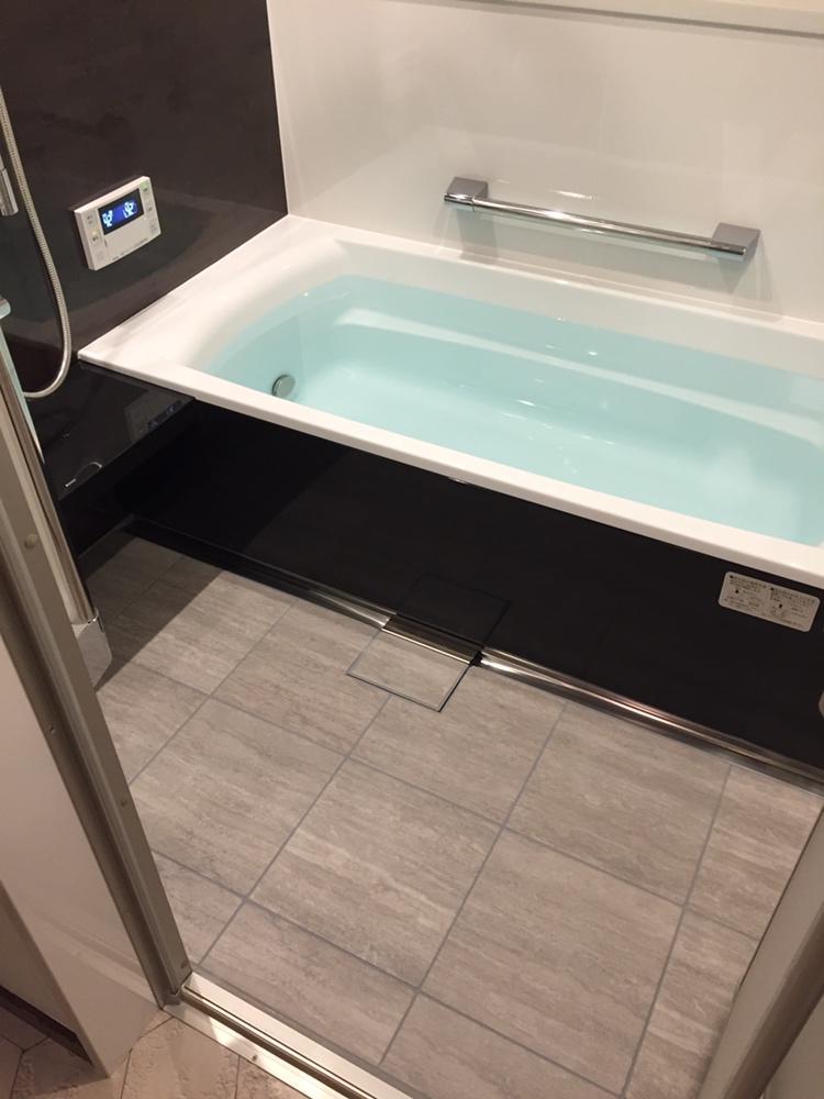 浴室を少しでも広くしたいというお客様のご要望もあり、 向きを変えて、足の延ばせるゆったりとした浴槽に。 床やパネルもダークカラーにしてスタイリッシュな浴室になりました。