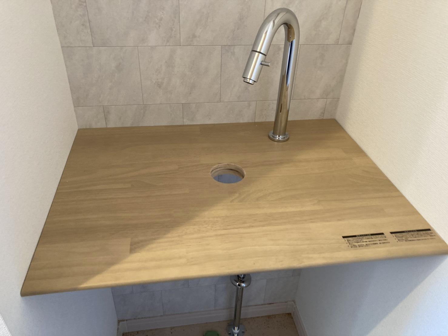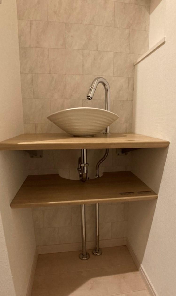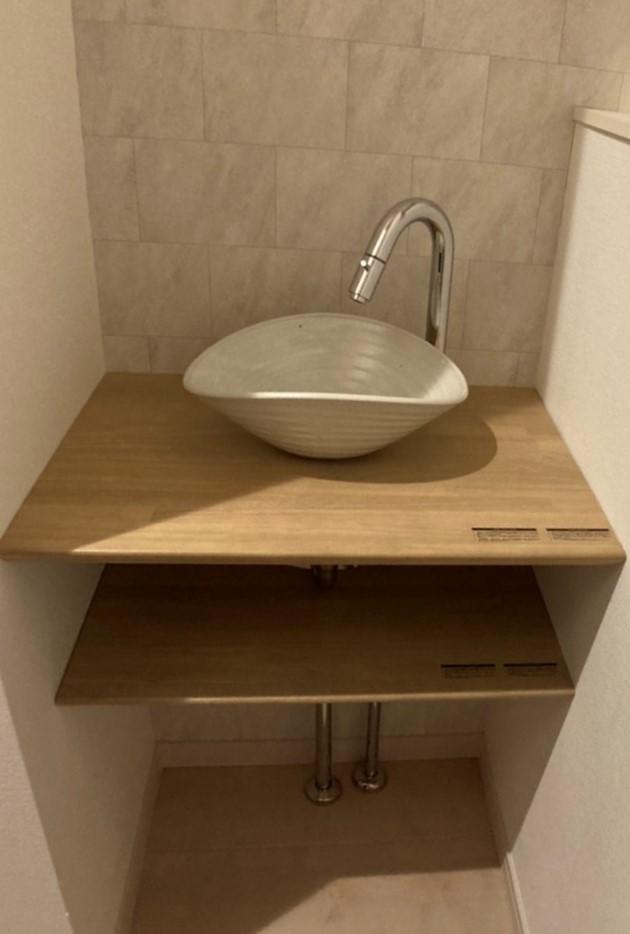 新築時にこの場所に手洗いを設置することを計画されていたそうで、既にスペース、水の配管の準備がされていました。 お客様御支給の手洗いボウルも素敵でした。 後付けであるにも関わらず、お家の雰囲気になじんで素敵な空間になったと思います。 ありがとうございました。