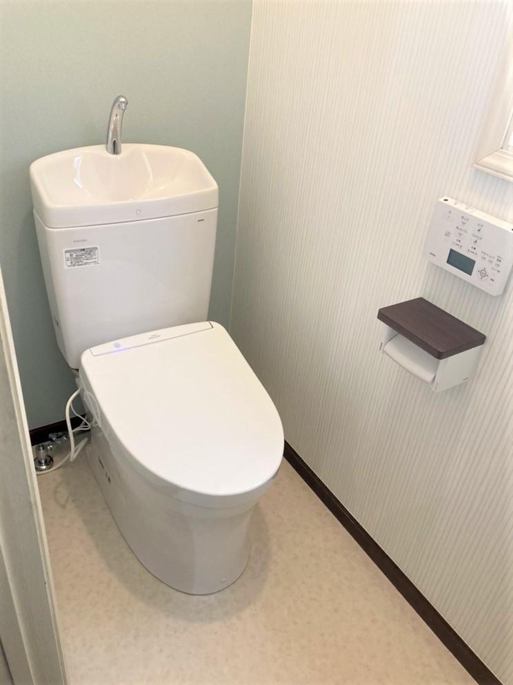 お掃除がしやすいフチのないトイレにリフォームしました。 アクセントカラーの壁紙が爽やかで明るいトイレになりました。